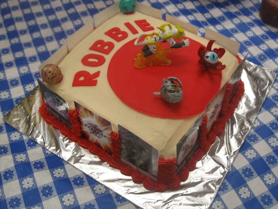 For my oldest sons birthday. I did cheat and used laminated bakugan cards for the sides and toy figures. Also tried fondant for the first time. Again, many thanks to CC!