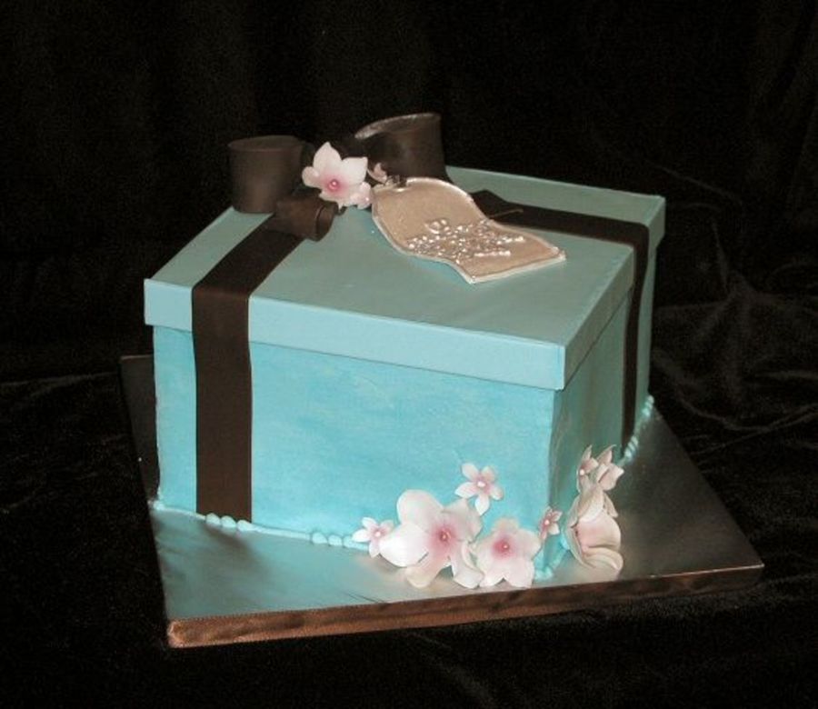 8" sq. iced in buttercream with fondant lid and bow.