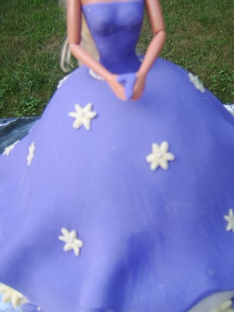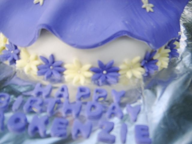 The picture makes it look blue, but it is purple. Chocolate cake covered in MMF, with MMF accents.