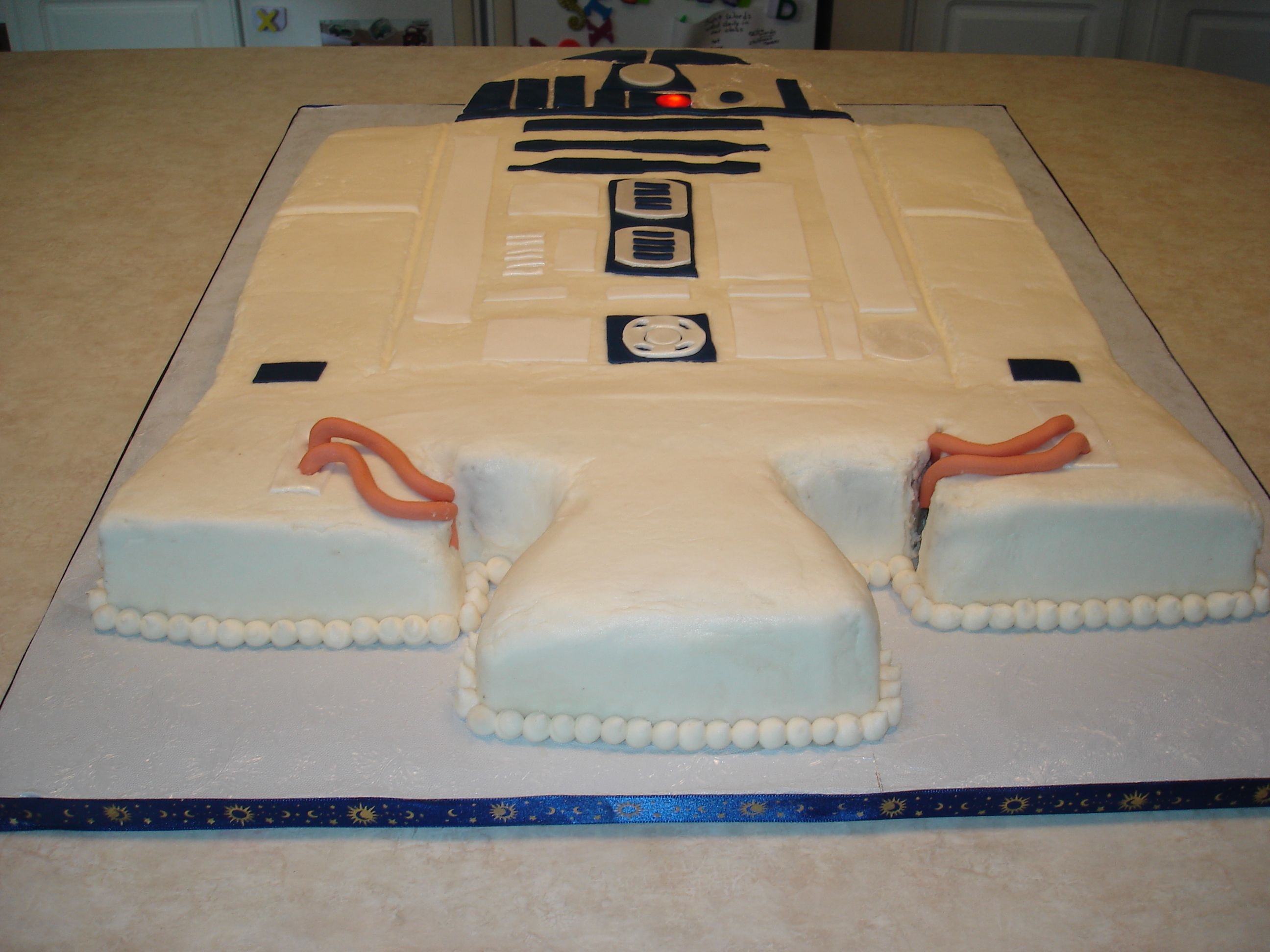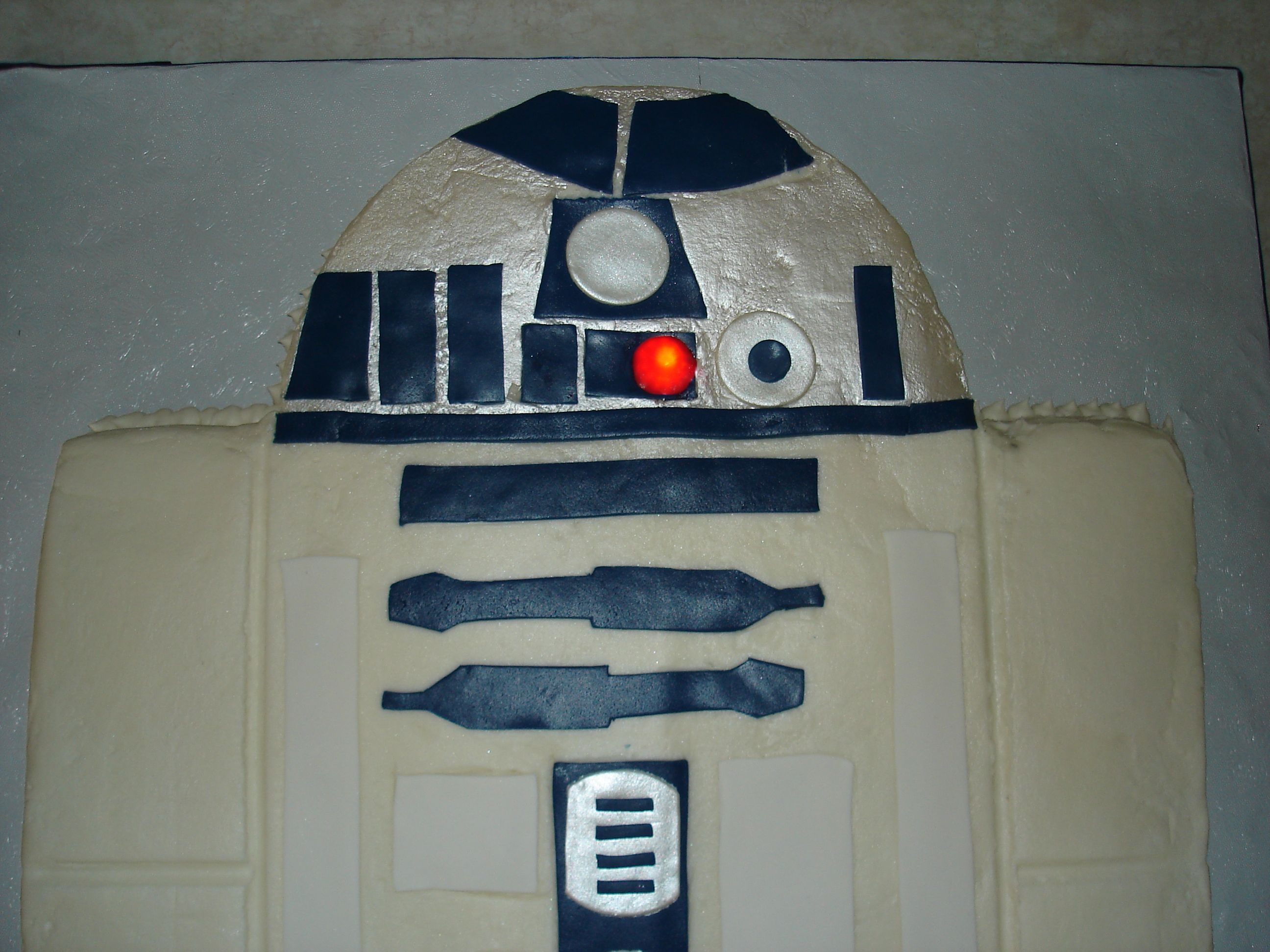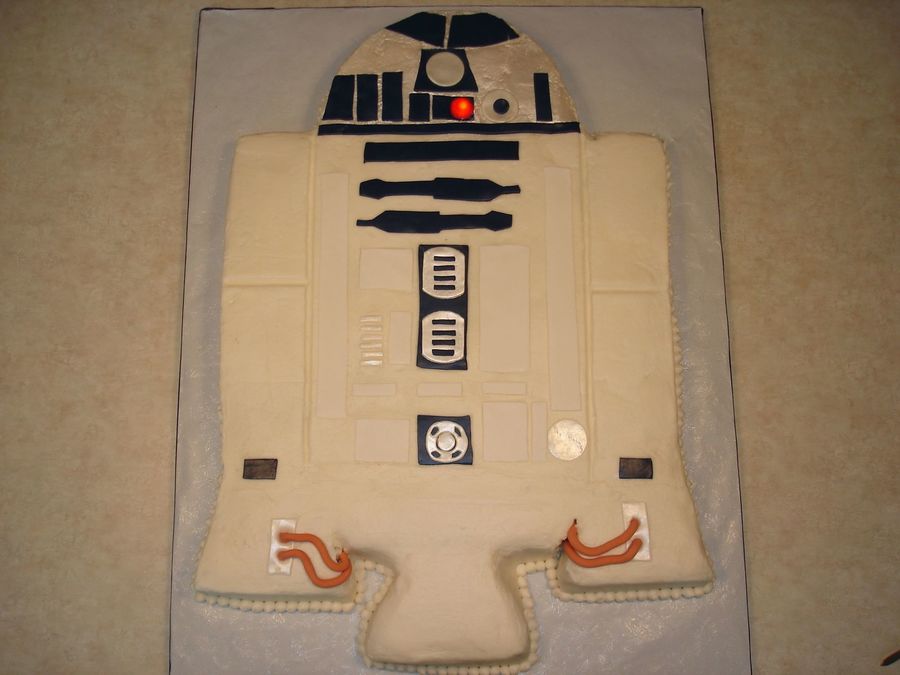 R2D2 is all chocolate with buttercream icing and fondant accents. The light is a real working light I purchased at Michaels. Got the idea from other CC'ers. Thanks, it really made it come to life. It was constructed with two 9x 13's and two 9" rounds. Thanks also to all the other CCer's that helped guide me through this.