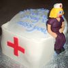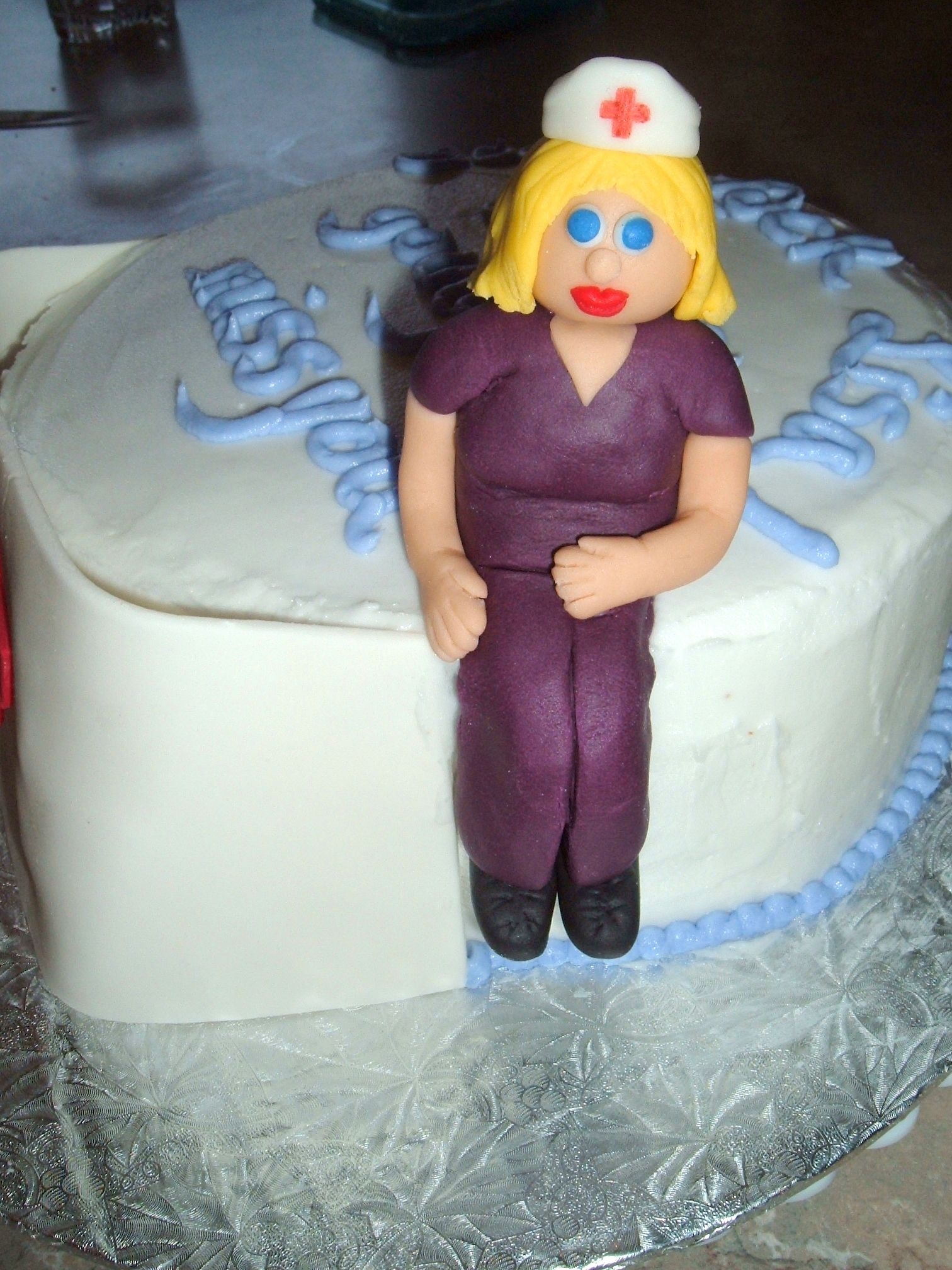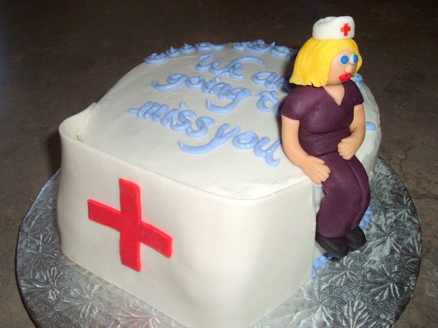 Shaped to look like a nurse's cap done in gumpaste/fondant is leaning against a 8" chocolate banana cake filled with vanilla mousse. The nurse character was my first 'real' character and is made out of fondant/gumpaste.