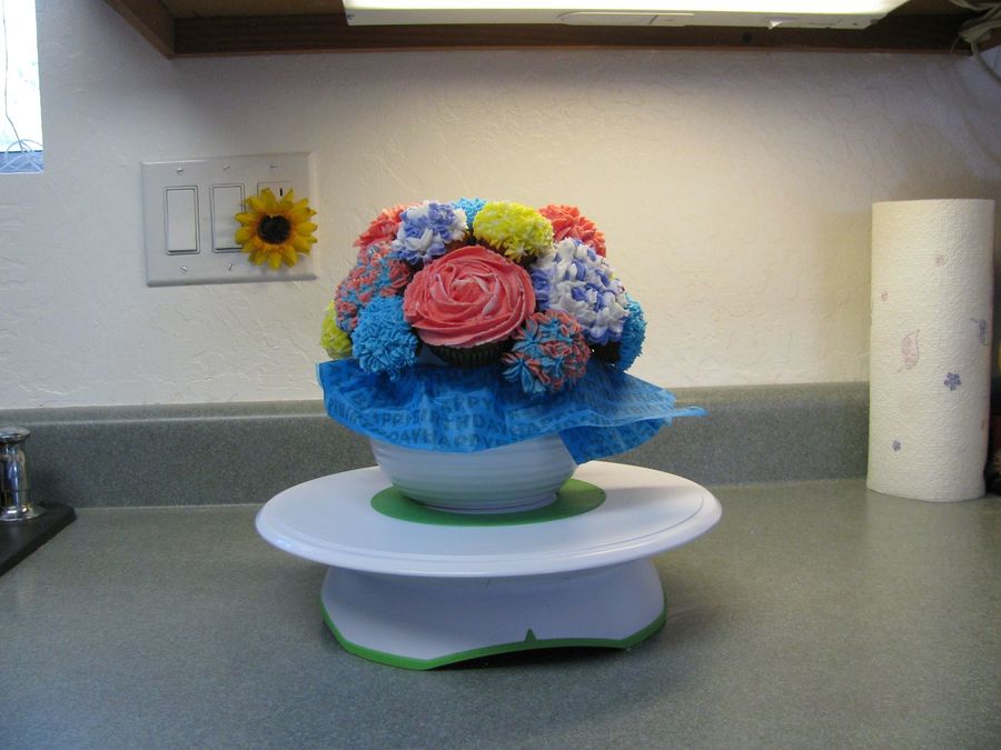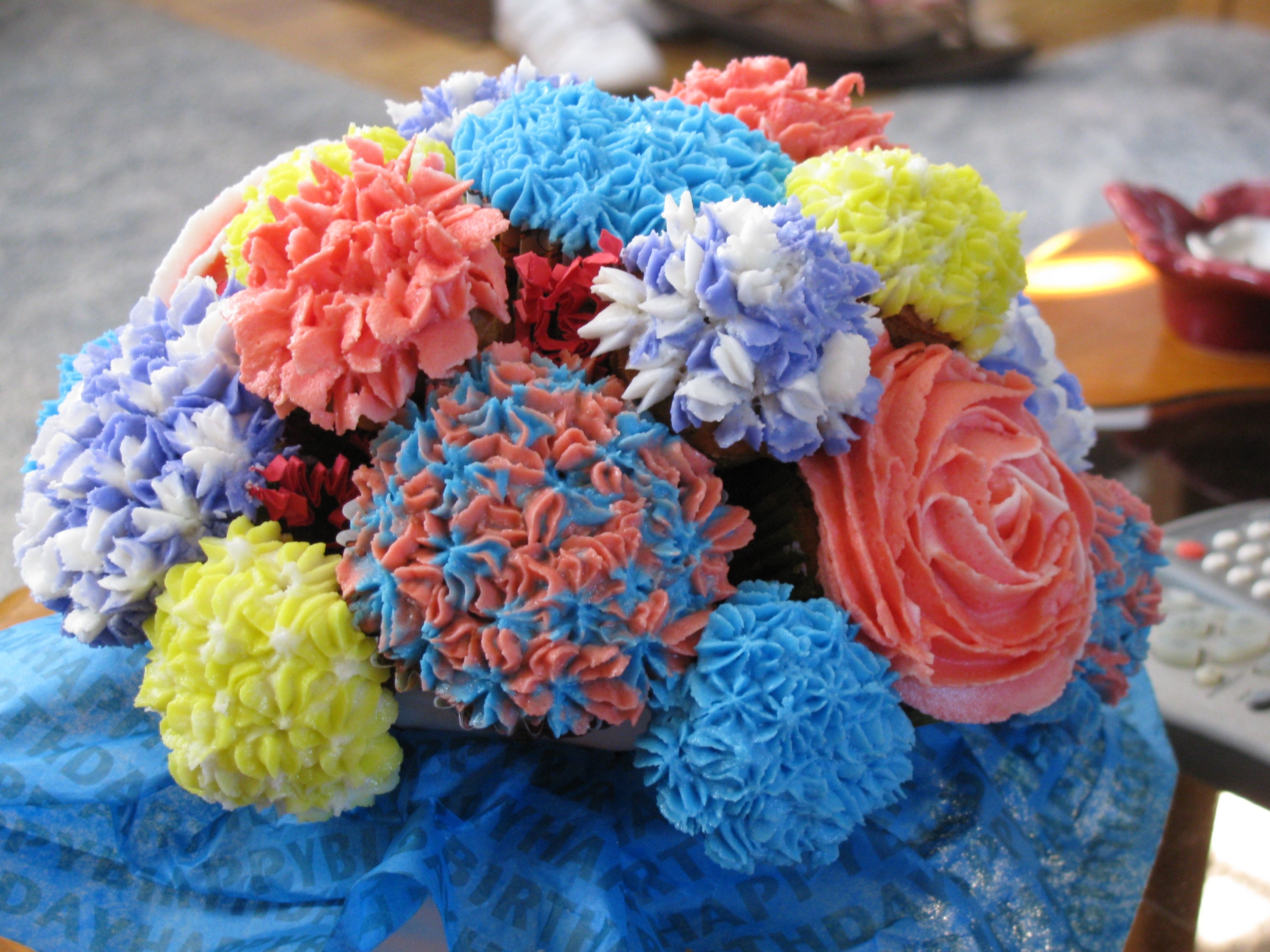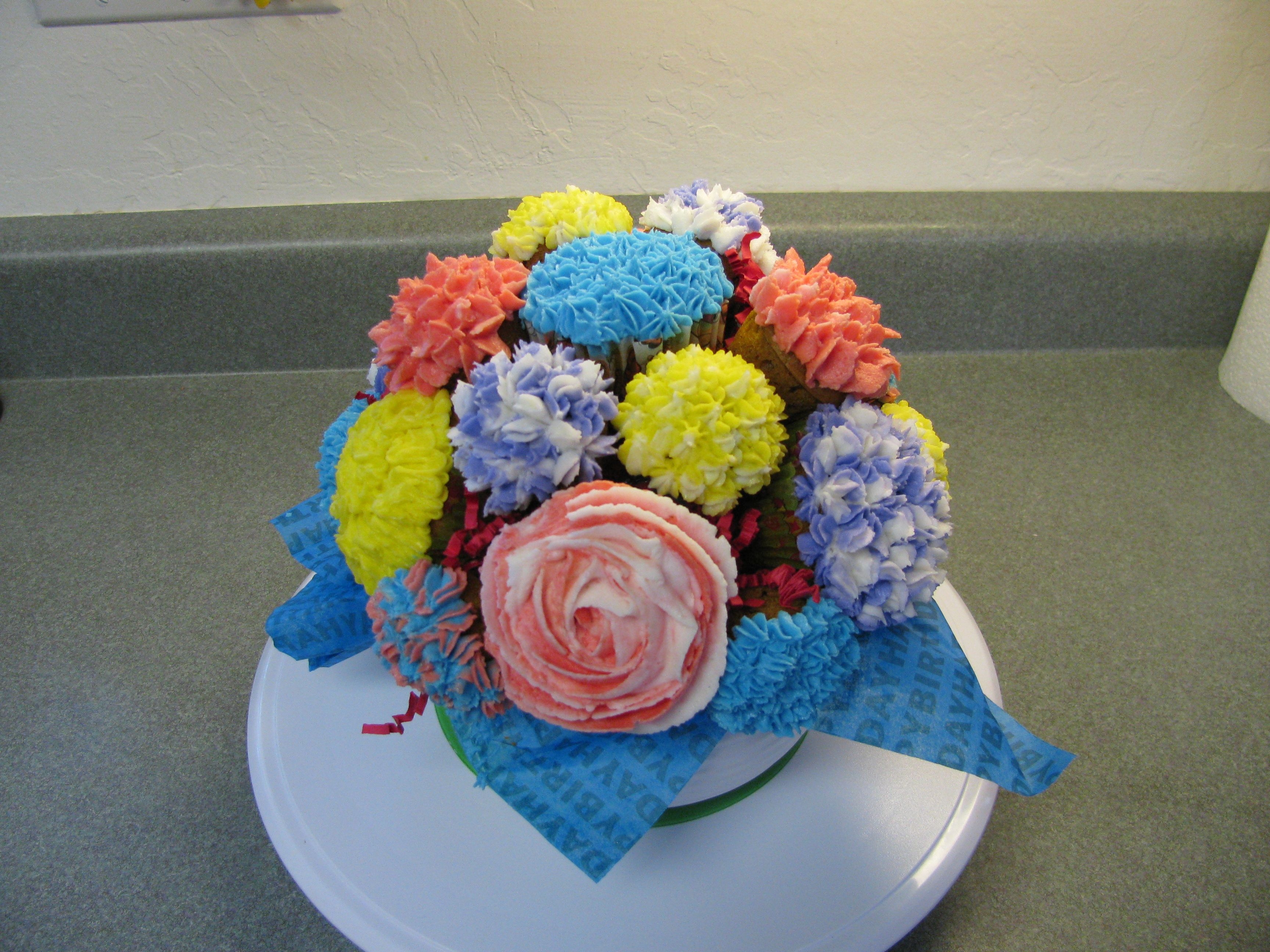 This is my first attempt at a cupcake bouquet and piping with buttercream. I think it turned out okay. I made this for my brother's birthday. The cupcakes are pumpkin apple.