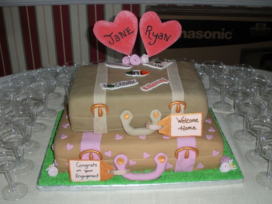 This was a welcome home/engagement cake for my cousin. They got engaged in Ireland. The bottom vanilla cake/buttercream and top chocolate cake/strawberry filling. The decorations are fondant.