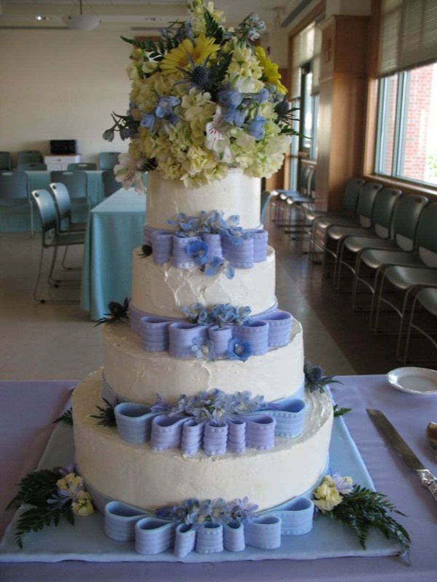 Mango, Lemon, and Key lime flavored cakes. Fondant ribbons to match the brides made dresses and flowers to match the bouquet. This was almost a disaster b/c it was 98 degrees when i delivered it and it is a swiss buttercream. Fondant also faded during 10 minute drive so some of it had to be rerolled