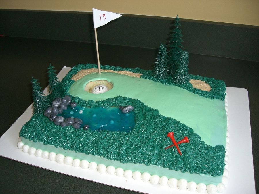 This was a fun cake to make. I decided to put some golf balls in the water, which was a big hit.
