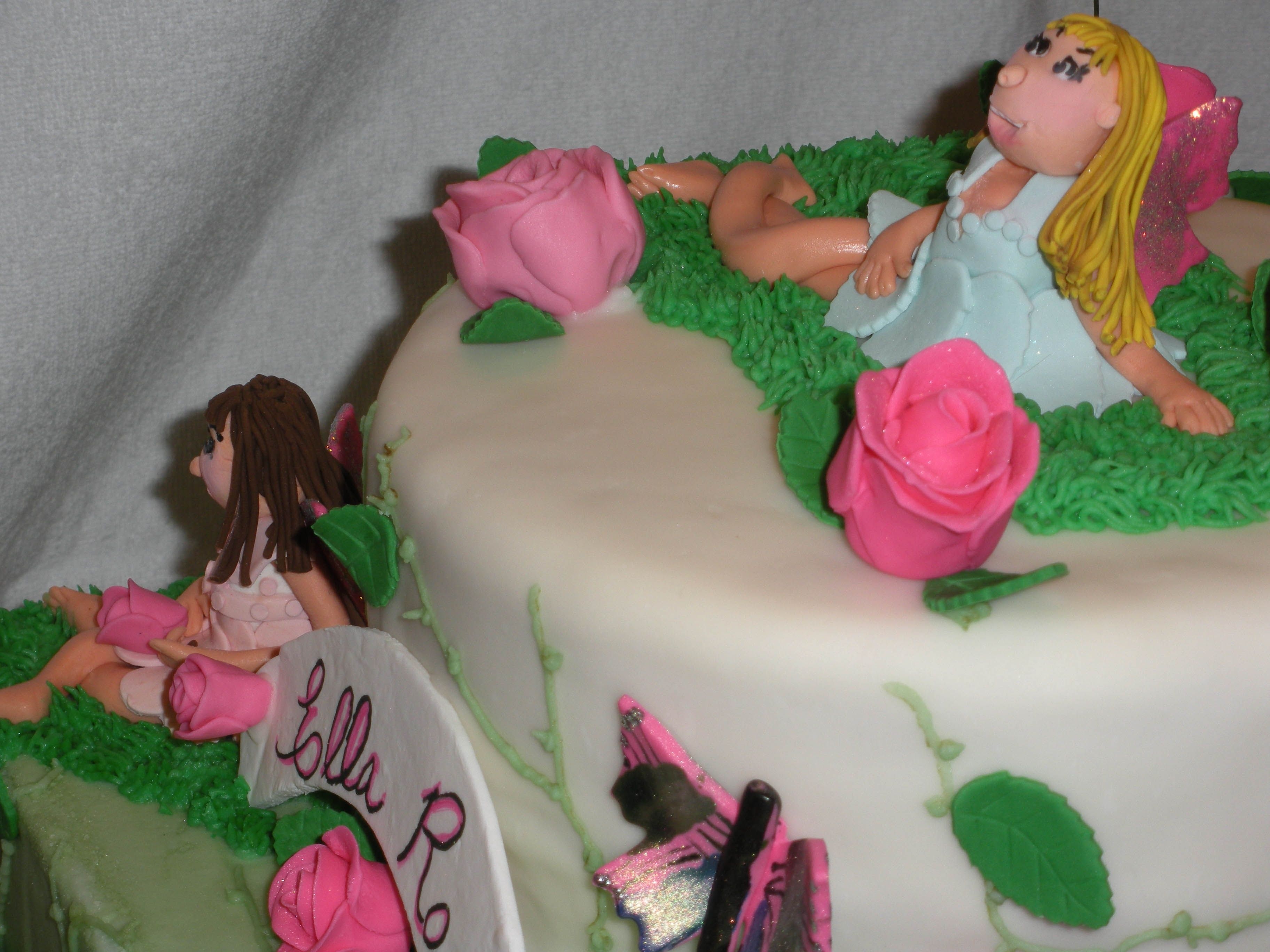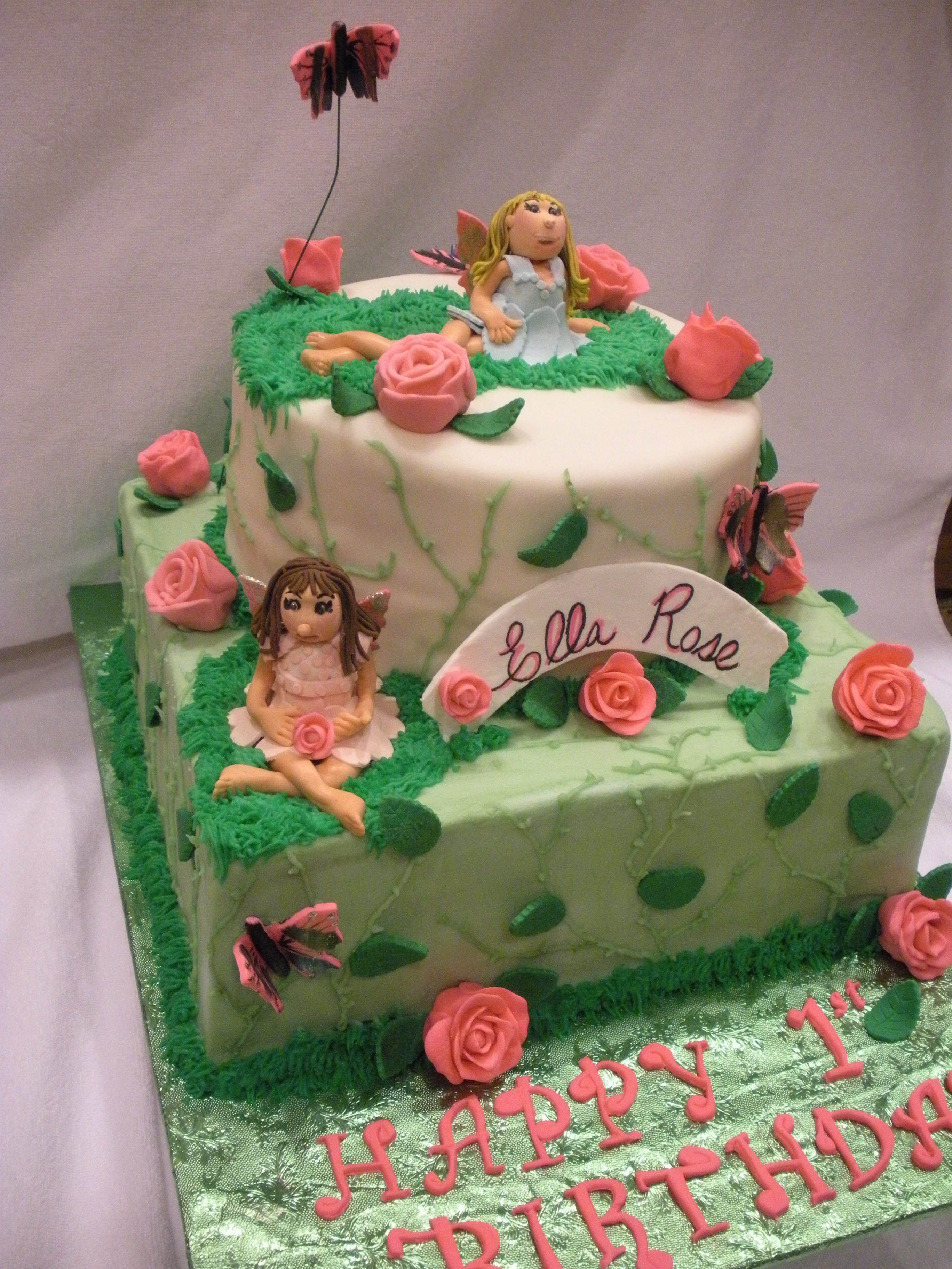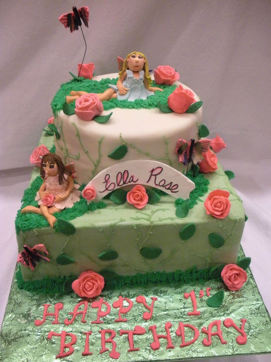 this was a 2 tiered first birthday cake with a roses and fairies theme...The roses as well as the fairies and butterflies were all made with a combination of gum paste/fondant.. The top tier was covered in MMF