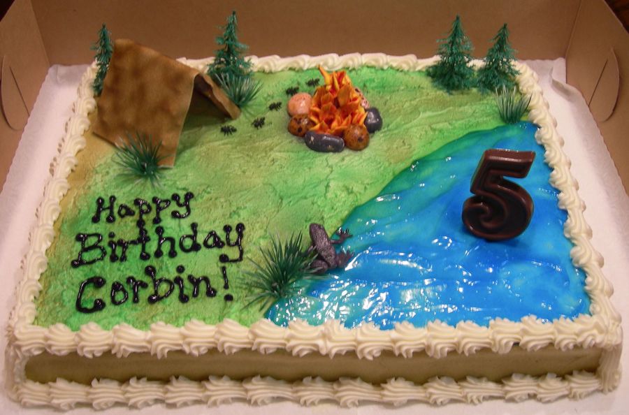 This is a chocolate cake with buttercream. The water is blue gel, and the tent is a pretzel frame held together with chocolate almond bark, with fondant covering. The fire is a pretzel frame with buttercream flames. The rocks around the fire are edible. The number 5 is chocolate almond bark mint. The bushes, trees, frog and ants aren't edible, LOL!!! TFL