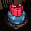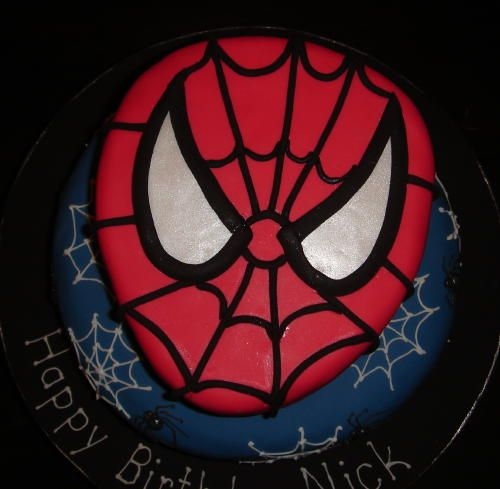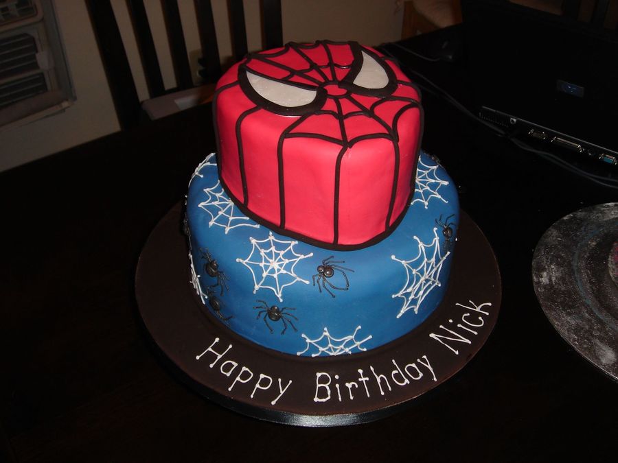 Inspired by the many cake here on cc. The top tier I shaped a little bit for his head. Web and spiders (really do not like spiders) are all royal icing. Top is all fondant. Cannot tell in the picture but I put luster dust to make his eyes shimmer. Thank you for looking.