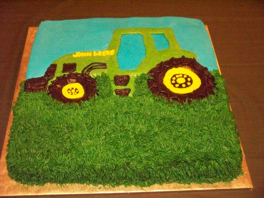 I MADE THIS CAKE WITH 2 SEPERATE PANS. I DIDN'T WANT THE TRACTOR TO SET THAT HIGH OFF THE BOTTOM LAYER. SO I PLACED IT WHERE I WANTED IT TO SET INSIDE A 14X14 PAN. THEN I ADDED CAKE BATTER TO BOTH PANS AND BAKED THEM TOGETHER. YOU CAN'T REALLY TELL IT IN THE PHOTO BECAUSE OF THE GRASS.