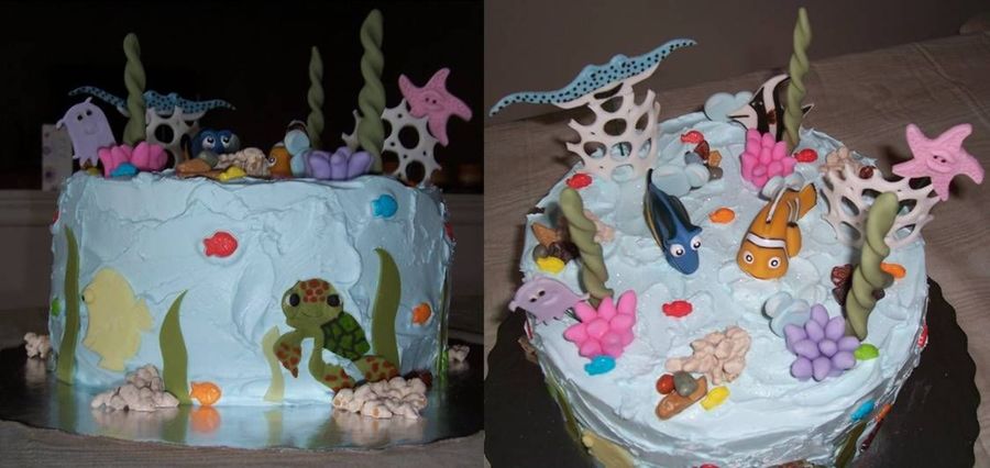 NEMO birthday cake. All is edible except for nemo and dory. All characters made of fondant (used edible marker). Rocks/fish are candy.