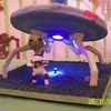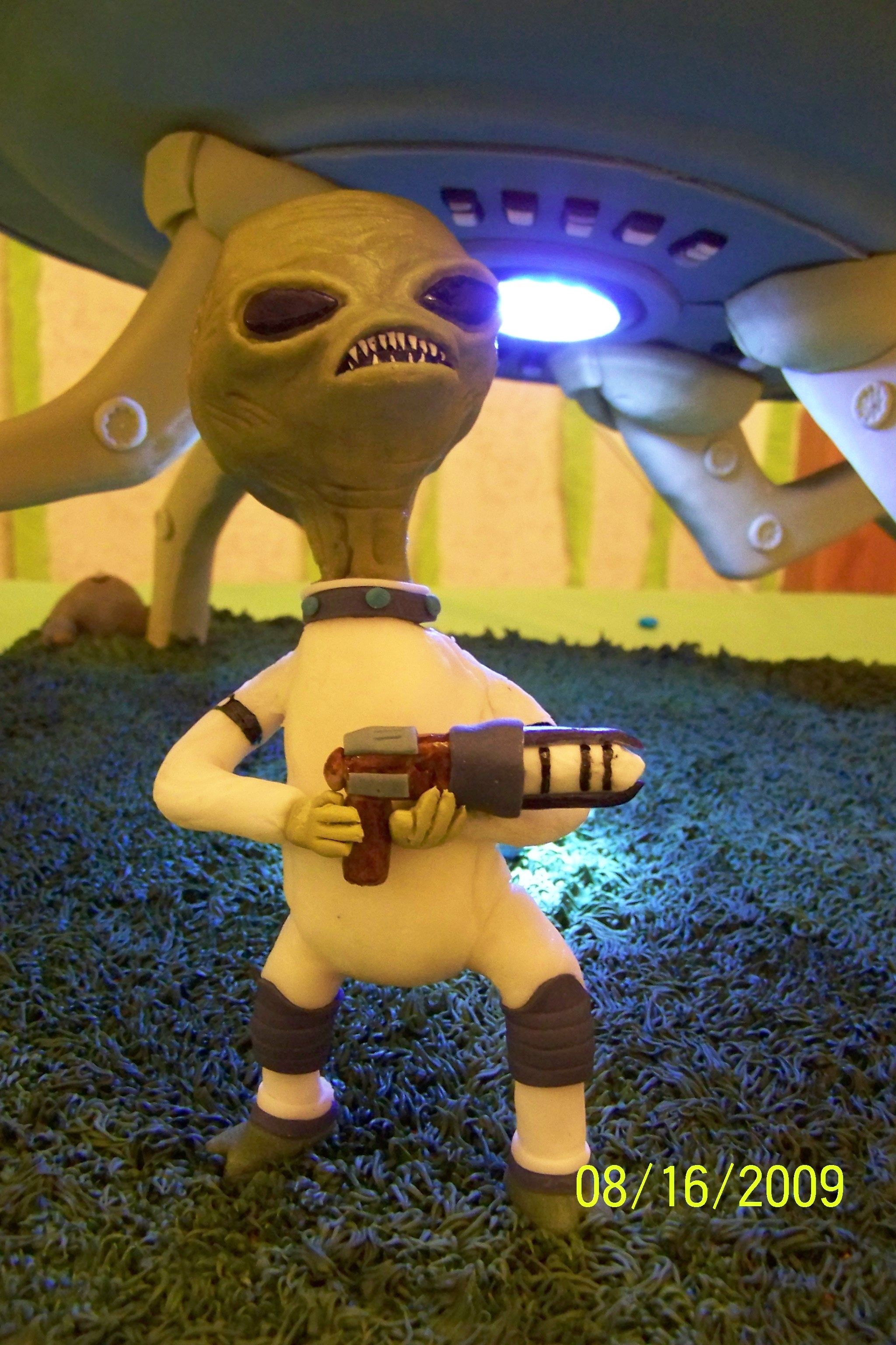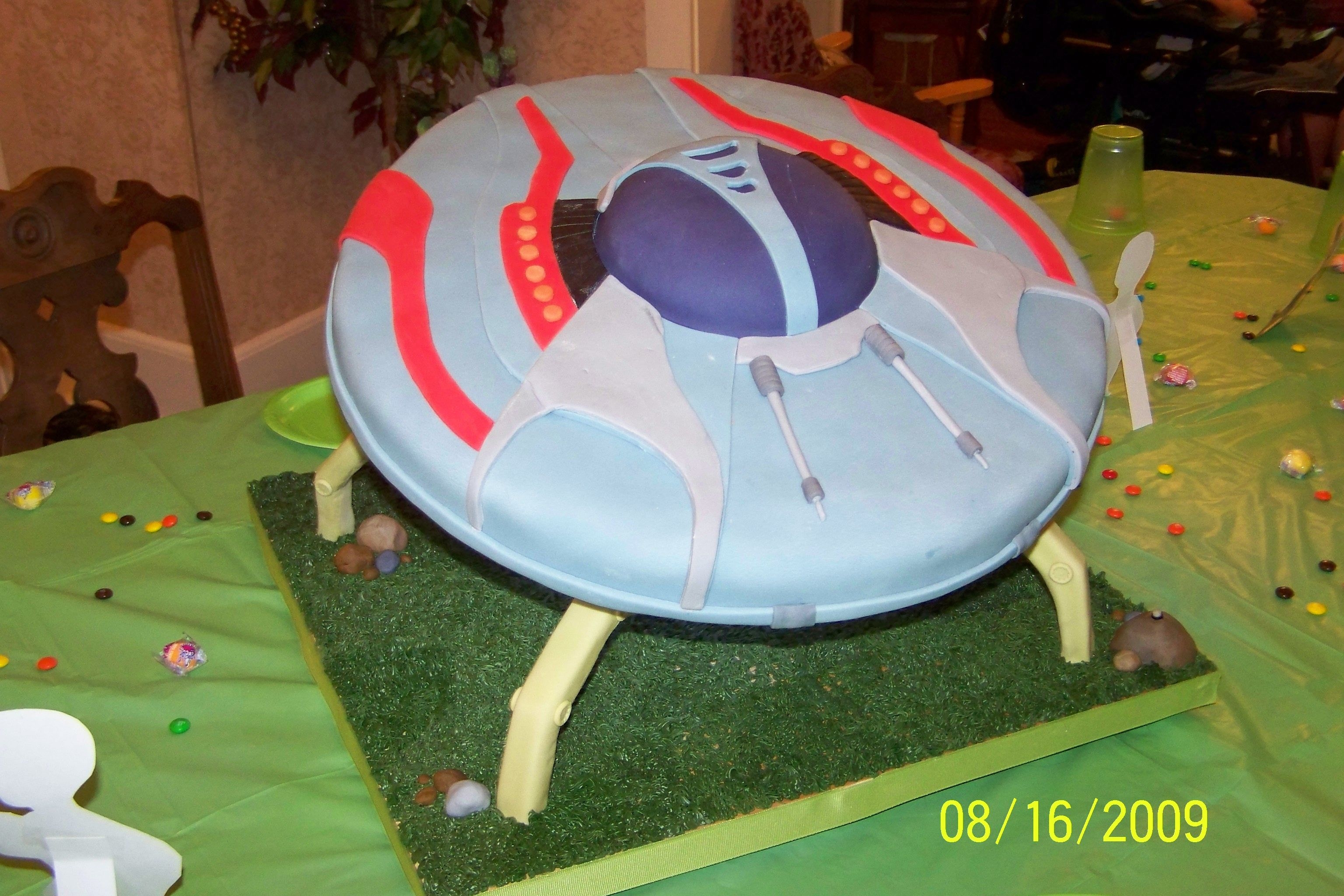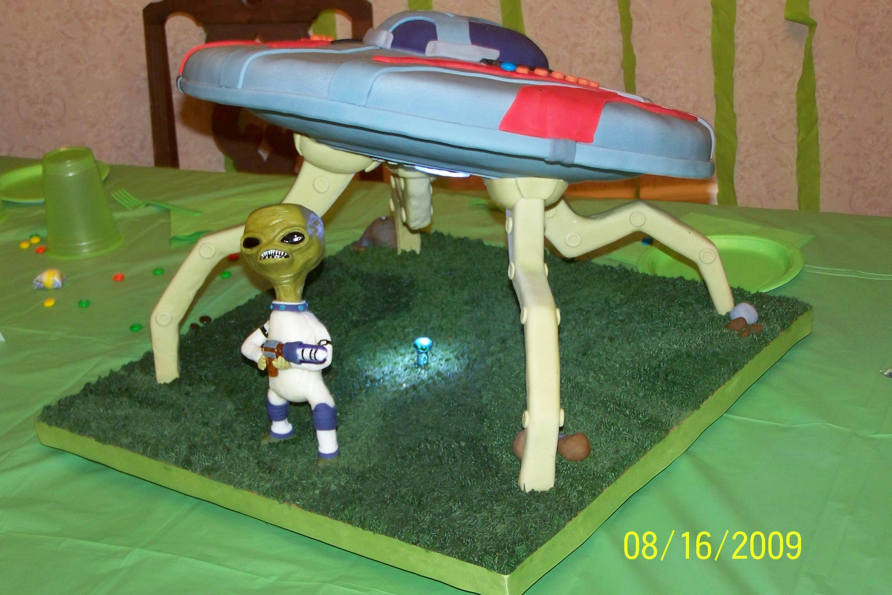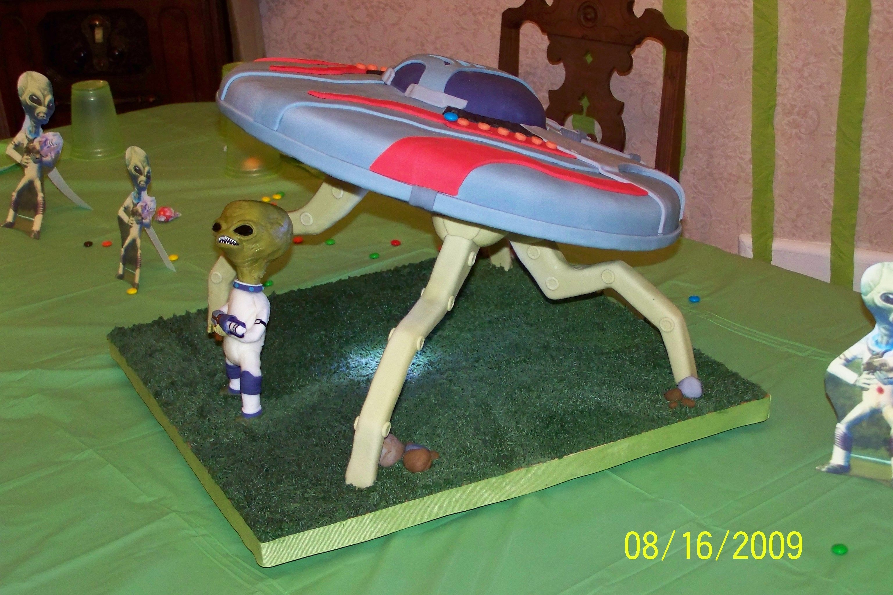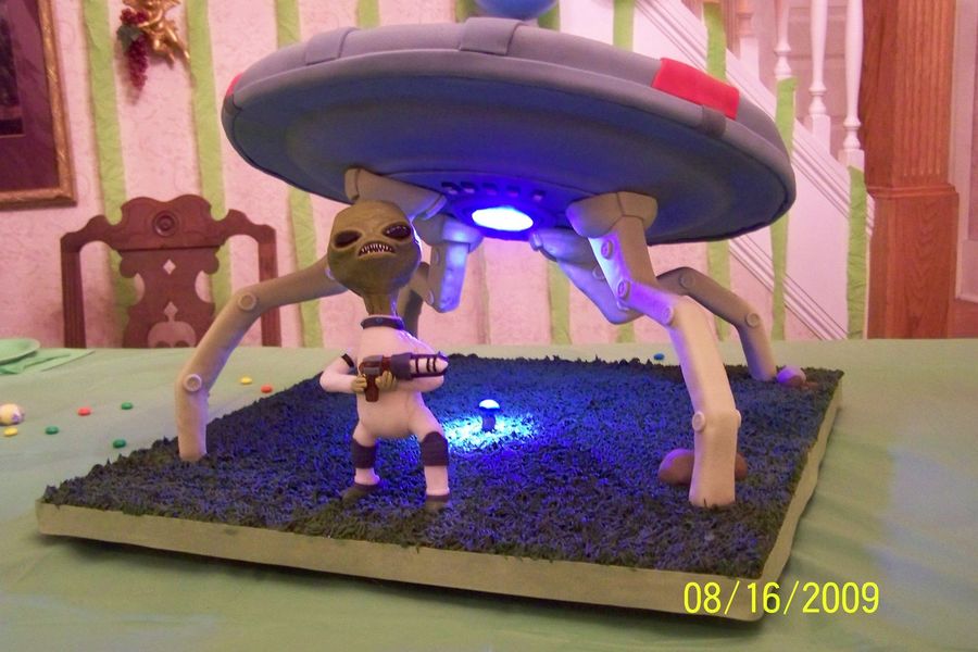 Son'd b-day cake. Spaceship supports are made of wood (to support the weight of the cake) and covered in fondant. Spaceship top was chocolate cake covererd w/ fondant. The alien was my first attempt of playing around with some homemade modeling chocolate. That stuff is kinda cool to mess around with! Put a light in the bottom of the space ship with a switch running to one of the fondat 'rocks'. (tiny alien was a small toy the the kids stuck in the light beam- didn't think about making one of those)