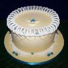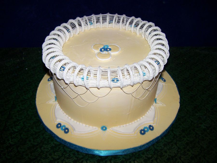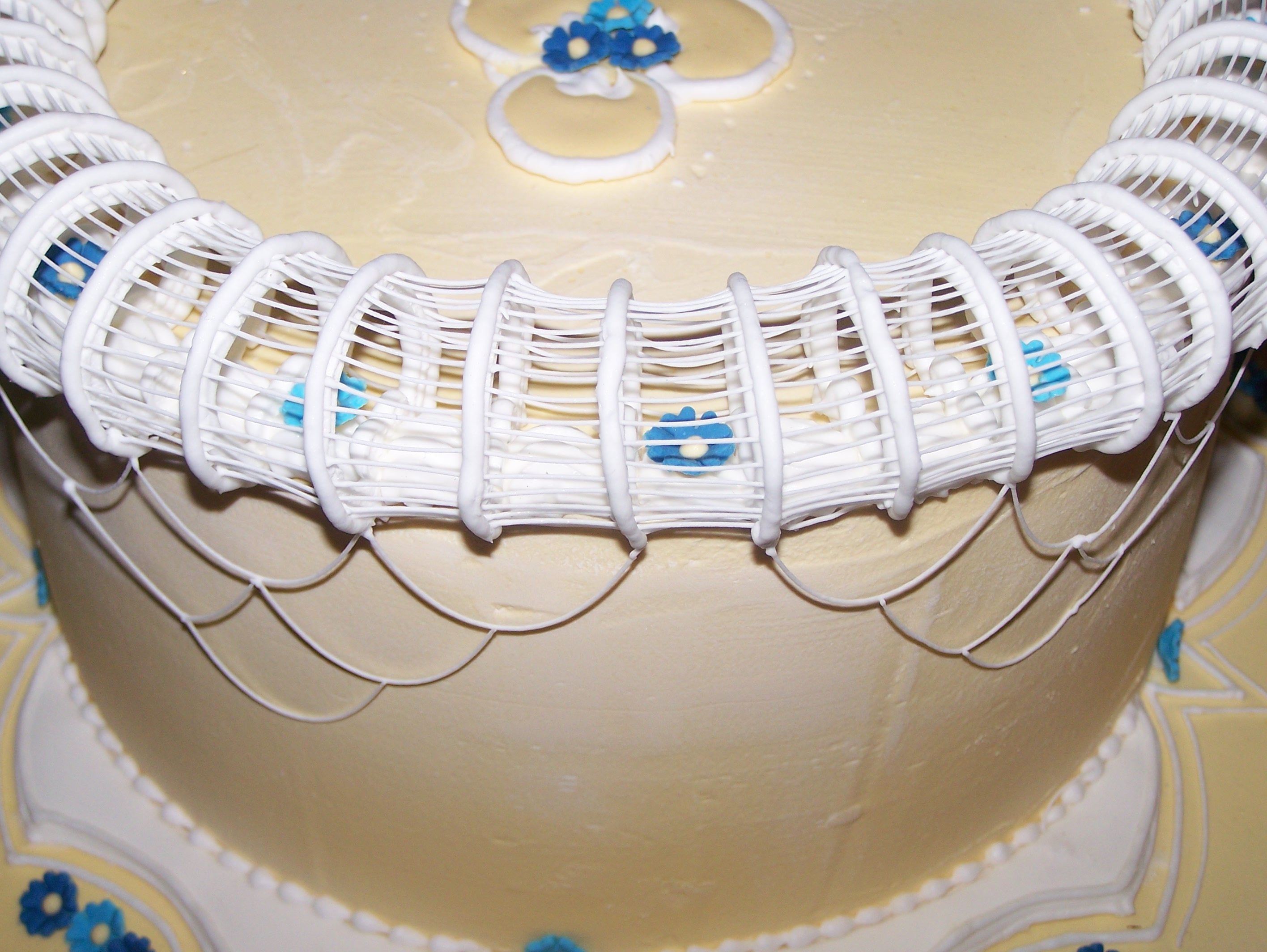 RI iced, with RI curls, stringwork in tip 0, flowers centerpiece is run sugar and flowers are GP.
