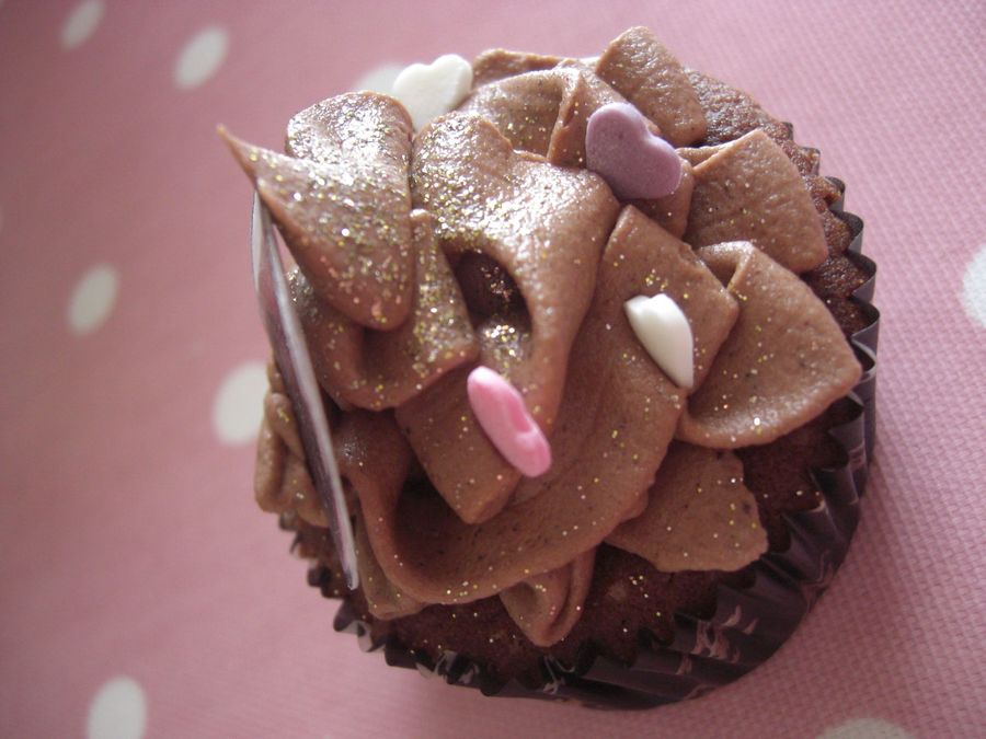 I made these for my husbands birthday. They have got pictures of him on rice paper (you can just about see them). They are soured cream chocolate cupcakes (Nigella recipe) with chocolate buttercream ribbon icing!