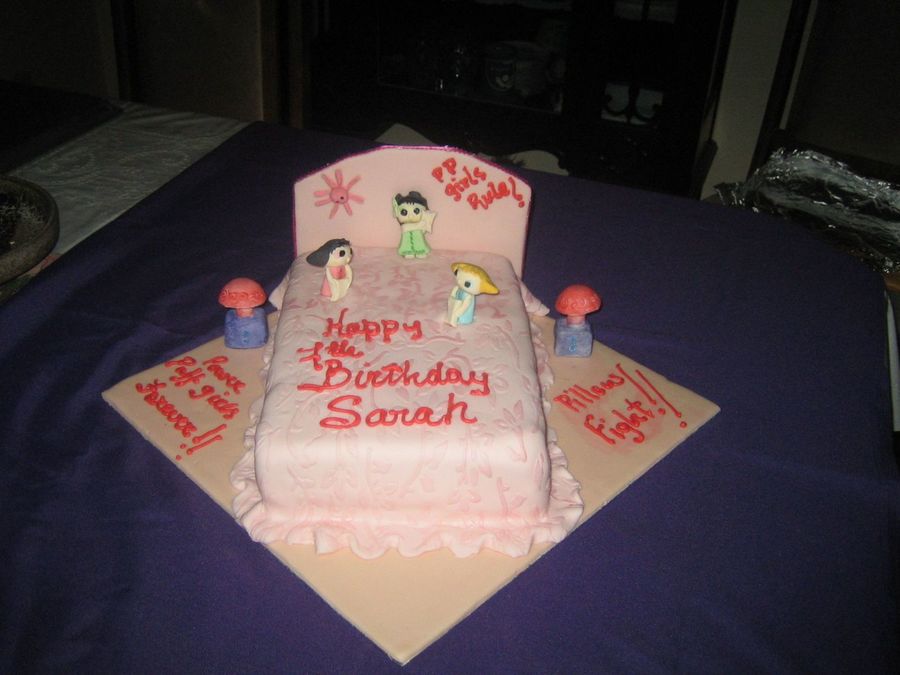 my version of a power puff girls pillow fight. Sarah loved it. The girls are gum paste as are the night tables. cake is fondant covered - bedhead is covered in fondant also