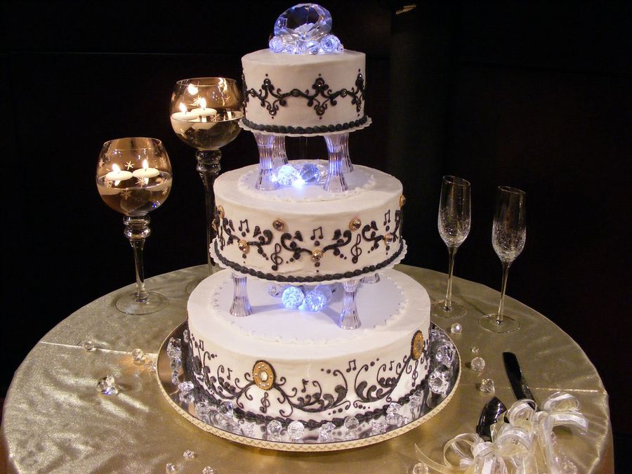This cake was done for my son's wedding. He's into Elvis; she's into Monroe. They had a retro Hollywood theme and wanted their cake to reflect that. Their colors were black & gold. Scroll work was free handed. "Diamonds" were scattered around base & table instead of rose petals. Next time would not use led lights as I felt it didn't blend well with the warm feel of the candles and gold tones.