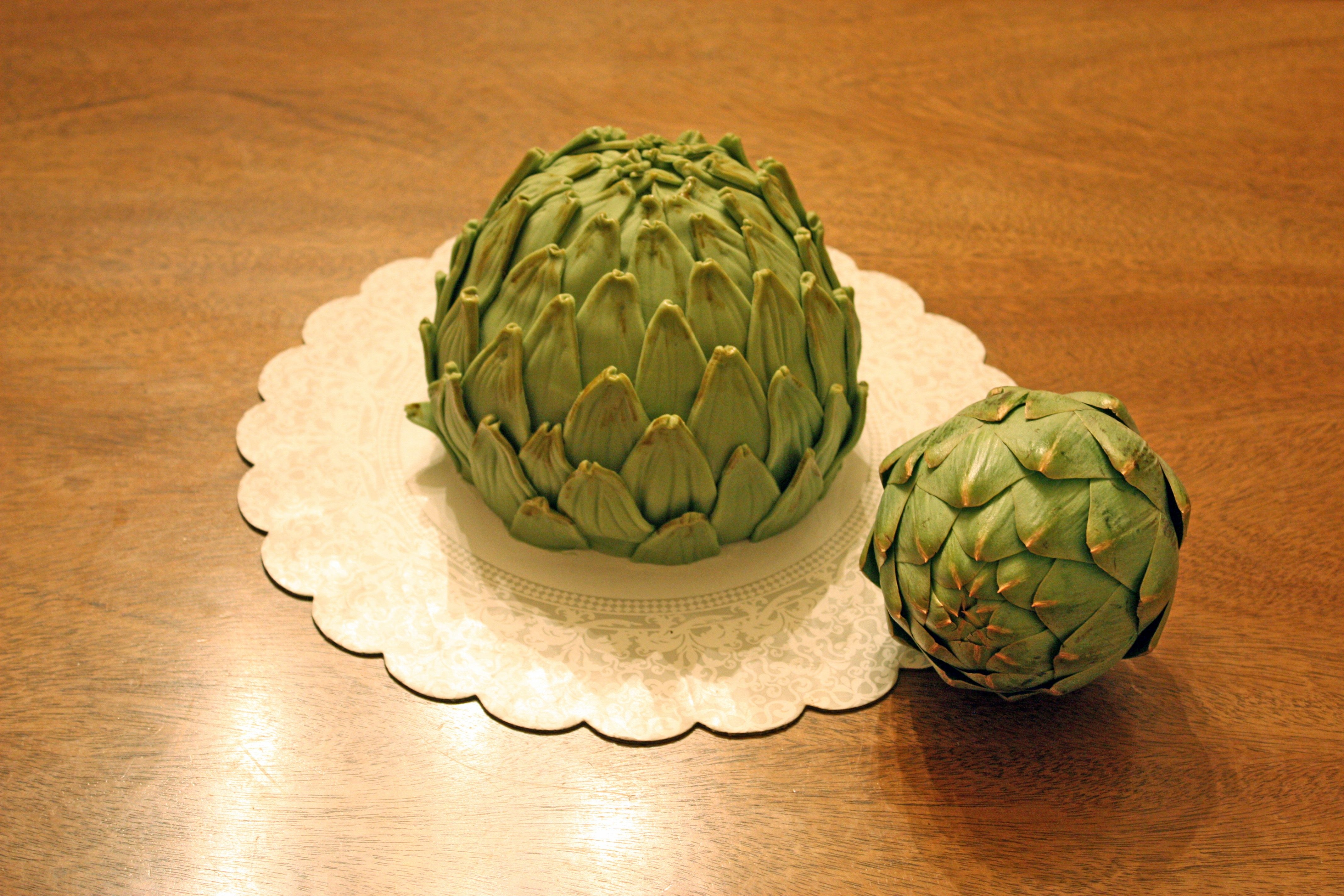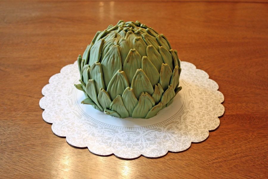 An artichoke cake for the world's greatest artichoke fan - made with Wilton's cake ball pan and covered with leaves of fondant.