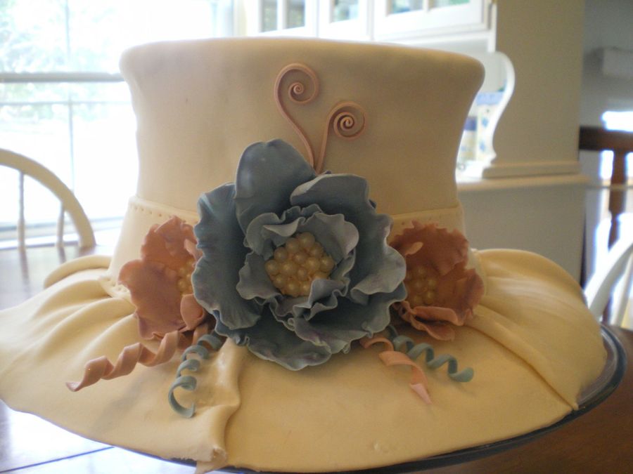 I made this cake for a church activity. The cake is 3 layers - chocolate/vanilla/chocolate, frosted w/ chocolate and covered in MMF. The flowers are made from gumpaste.