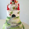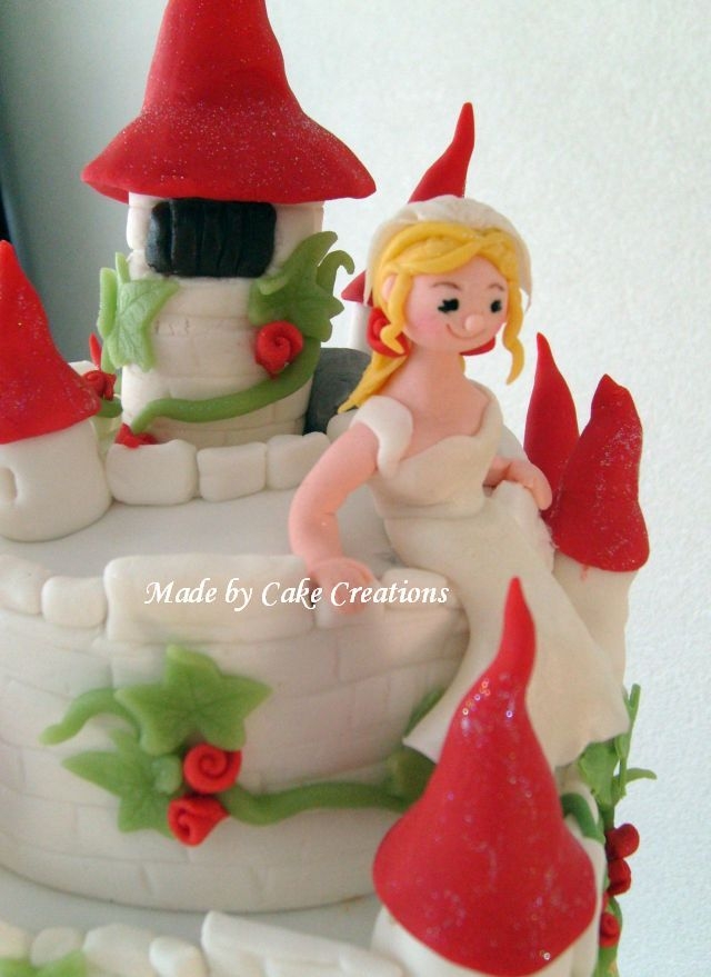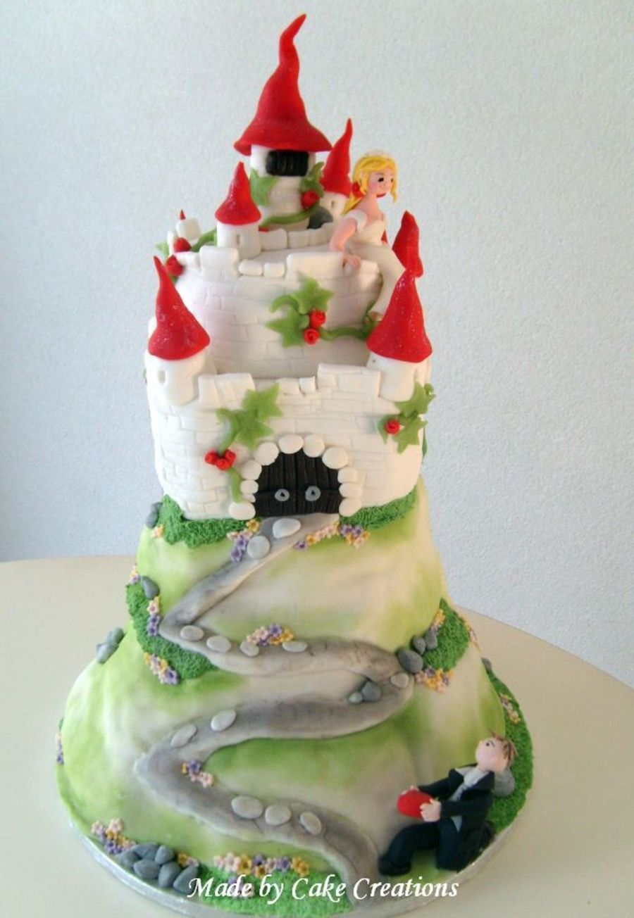 Wedding cake inspired by Debbie Brown. The groom offers his bride (sitting on the castle) his heart.