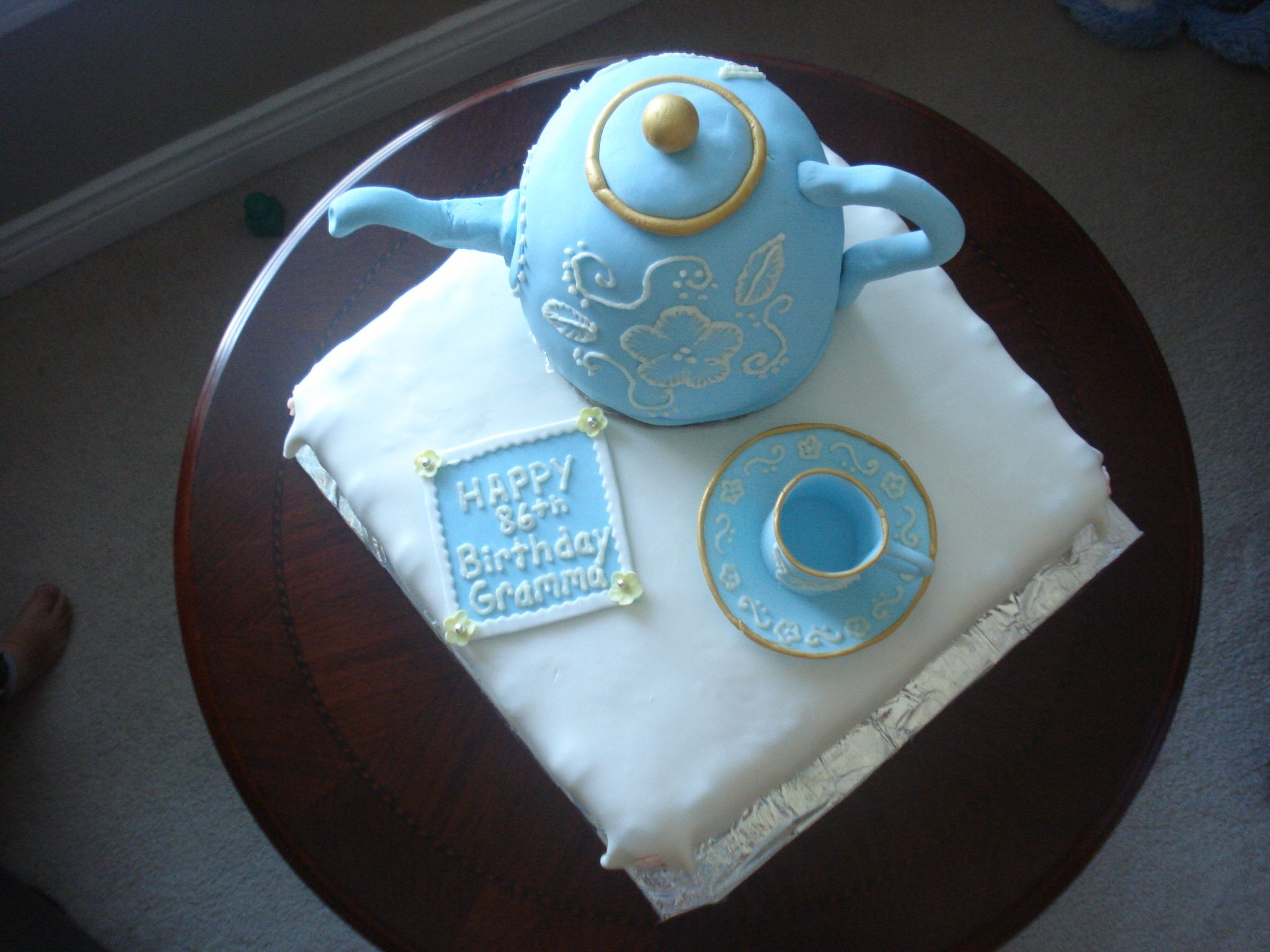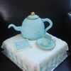 I made this for an 86 year old lady's birthday. The teapot is chocolate with strawberry cream filling and fondant and gumpaste decor. The 'table' is white vanilla cake with chocolate ganache filling. The cake was inspired by helipops and sugarsugargal, thanks girls. These are a lot harder to do than they look. I almost couldn't get the spout to stick to the cakes, had to use straw dowels. The teapot was made using a Pyrex mixing bowl and a 6 inch round and the bottom cake is a 12 inch square.