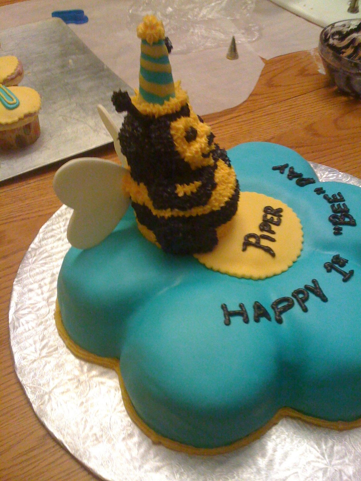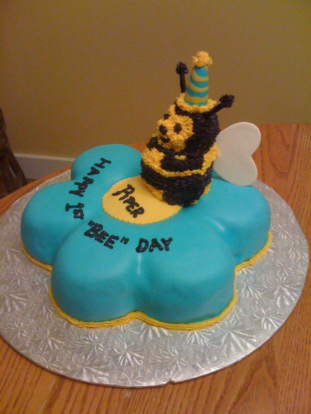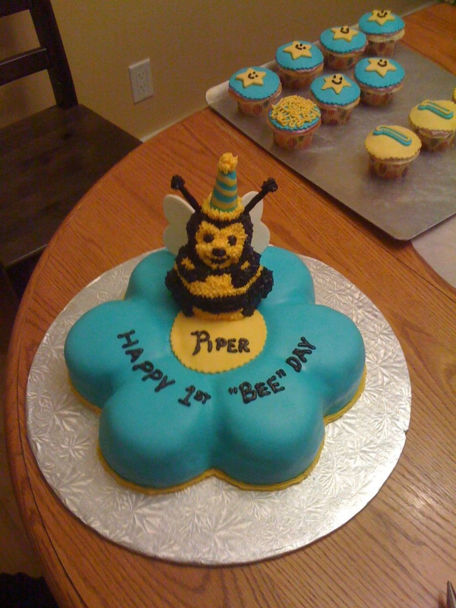 This is a white chocolate cake with white chocolate, berry buttercream filling. I used the wilton daisy pan and covered it with MM fondant. I made the bee with a mini bear pan (same kind of cake) , modified it and covered it with buttercream. The wings are MM fondant and the hat is a fondant covered ice cream cone. This was my gift for my cousins little boy. This was also my first time making MM fondant ..... I love working with it and everyone actually ate the fondant!