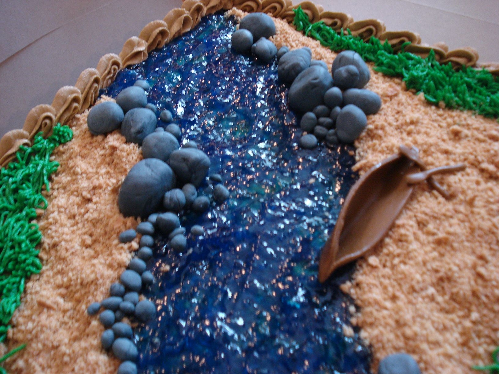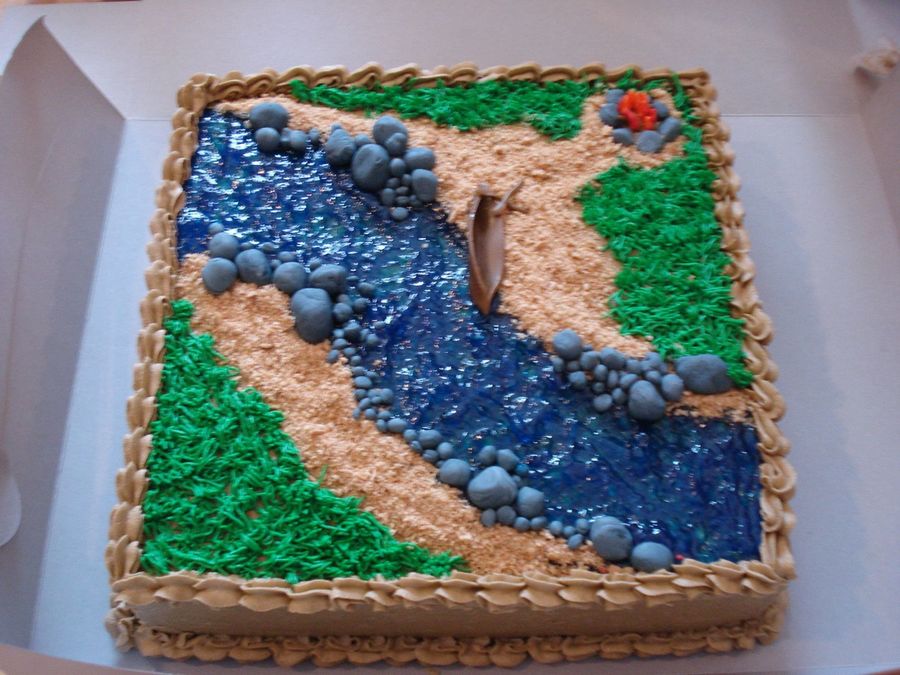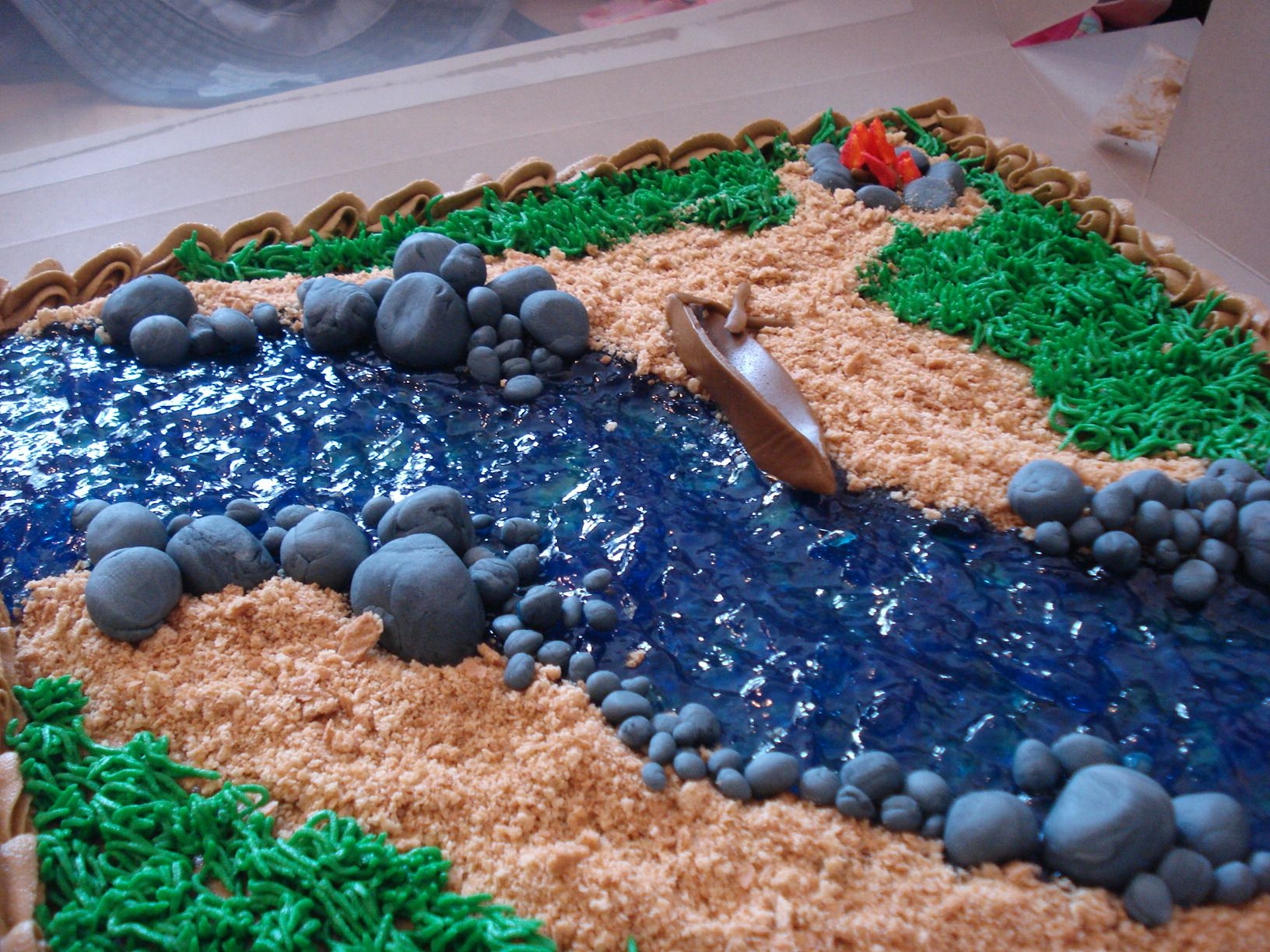 this is a choc cake with brown tinted buttercream icing. I used piping gel that i tinted blue for the water, fondant for the rocks and canoe, fire pit. flames were done in royal icing (red with a bit of yellow) using a leaf tip. grass is butter cream tinited and using a grass tip of corse. The sand was crushed up gram crackers