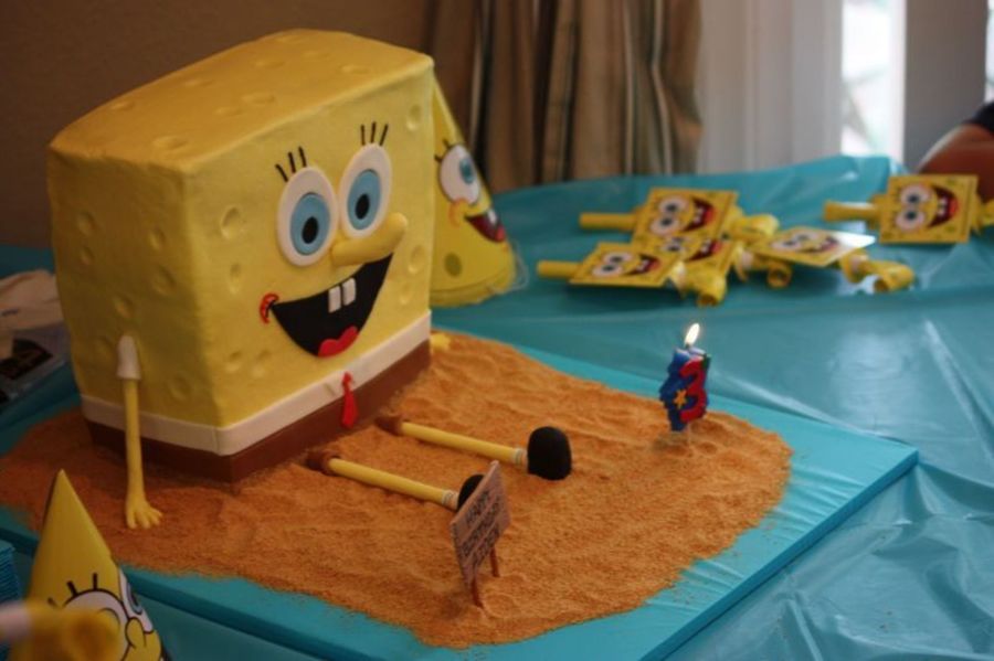 My son's 3rd birthday cake. Spongebob is buttercream with fondant accents. Crushed graham crackers for sand (sifted through a strainer), lollipop sticks for arms, dowels for legs, both covered in fondant. Thanks to cc member Cherry3 for the inspiration!