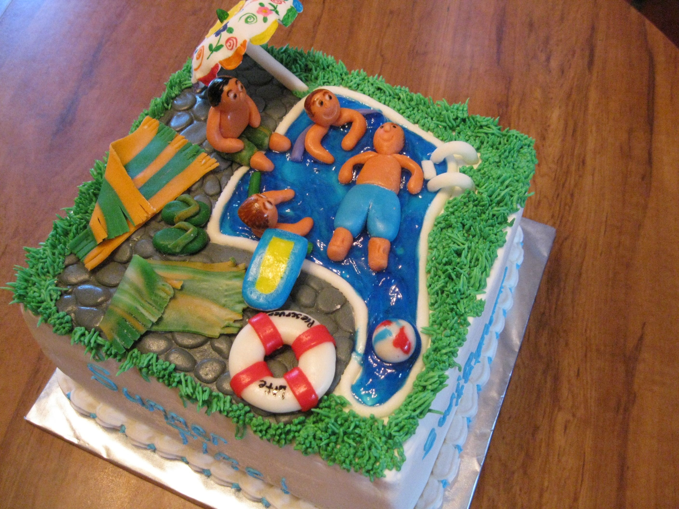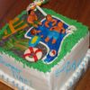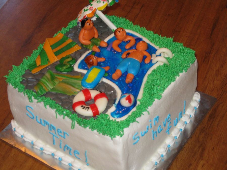 Chocolate cake filled with chocolate ganache(fudge) buttercream icing decorated with mmf 3-D figures water done with blue piping gel.