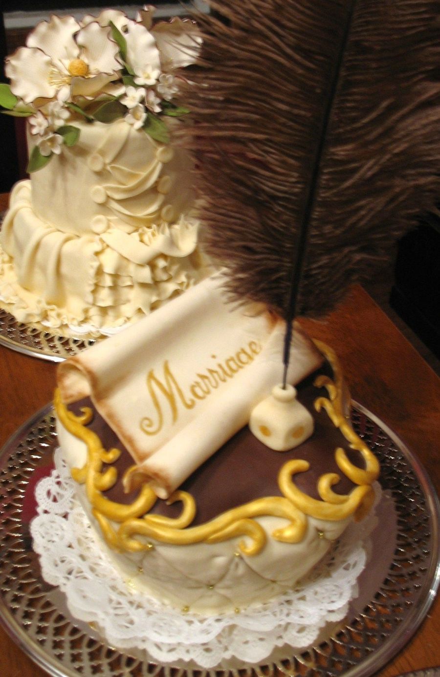 Background: Corset styled cake with Gumpaste flowers Foreground: Marriage certificate in gumpaste, fondant cake and ink bottle, real feather