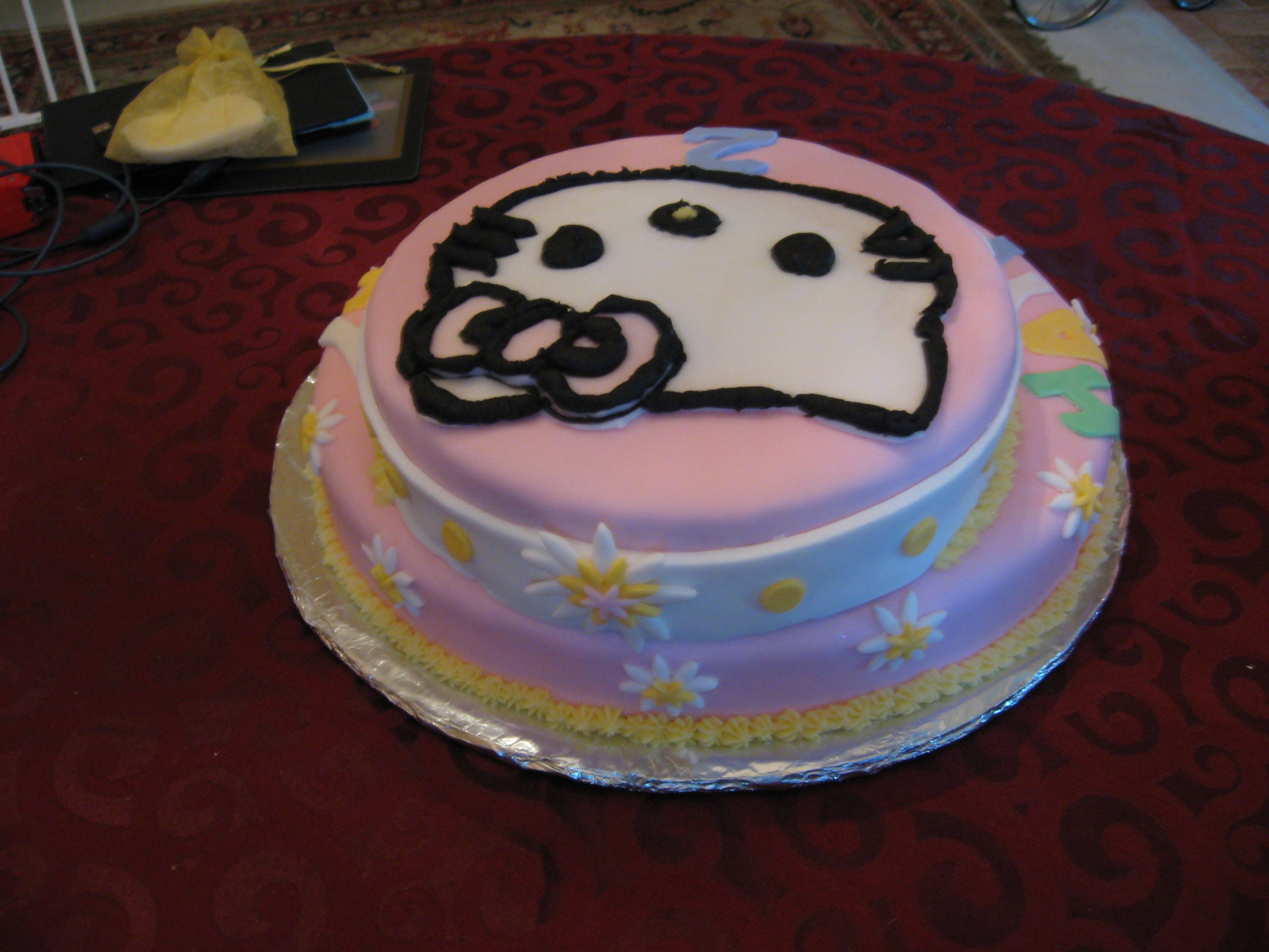 The bottom cake is a 14 inch and the top cake is a 10 inch. Cake covered on fondant. Hello Kitty made of fondant and black icing for face and outlining