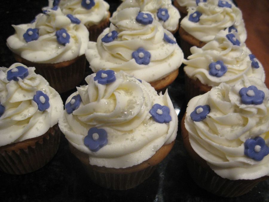 Cupcakes iced in buttercream with purple fondant flowers and edible glitter.