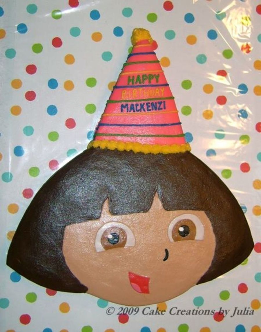 Dora - Carved and pieced from an 11x15 cinch pan. Completed cake was 15 x 17 inches. Chocolate cake covered with Buttercream icing. Fondant facial features.