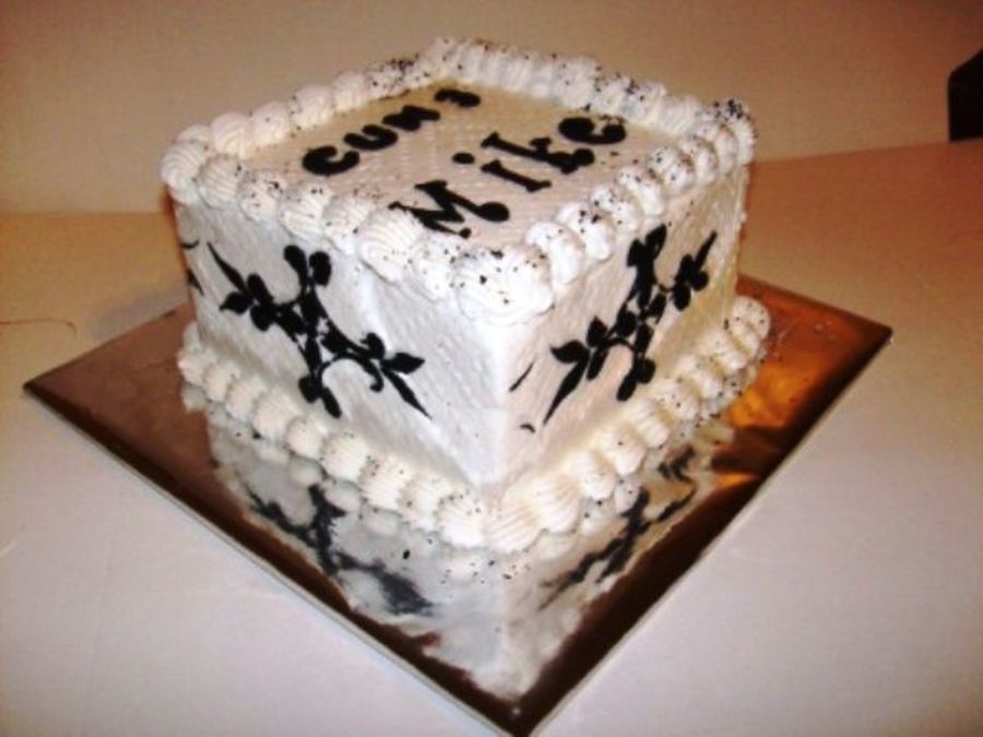 4x4 square cake, BC icing, paper towel impressions, stenciled sides. Fondant letter.