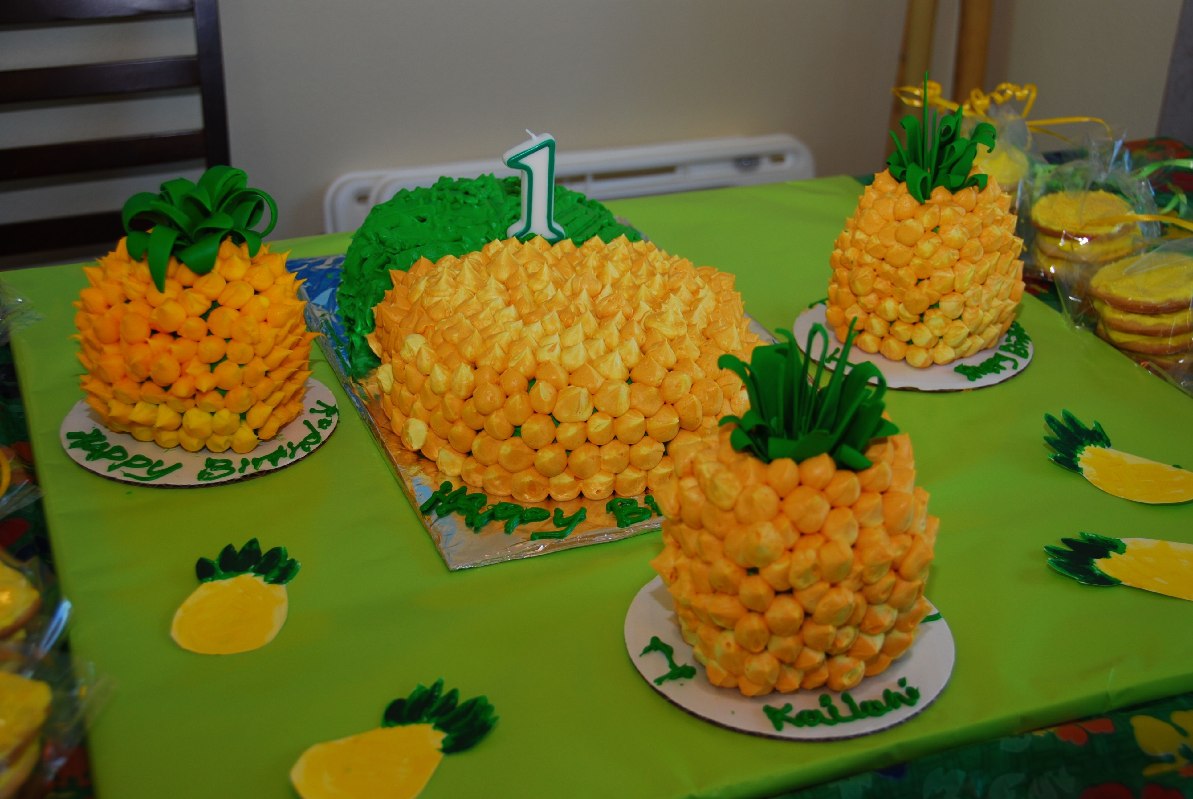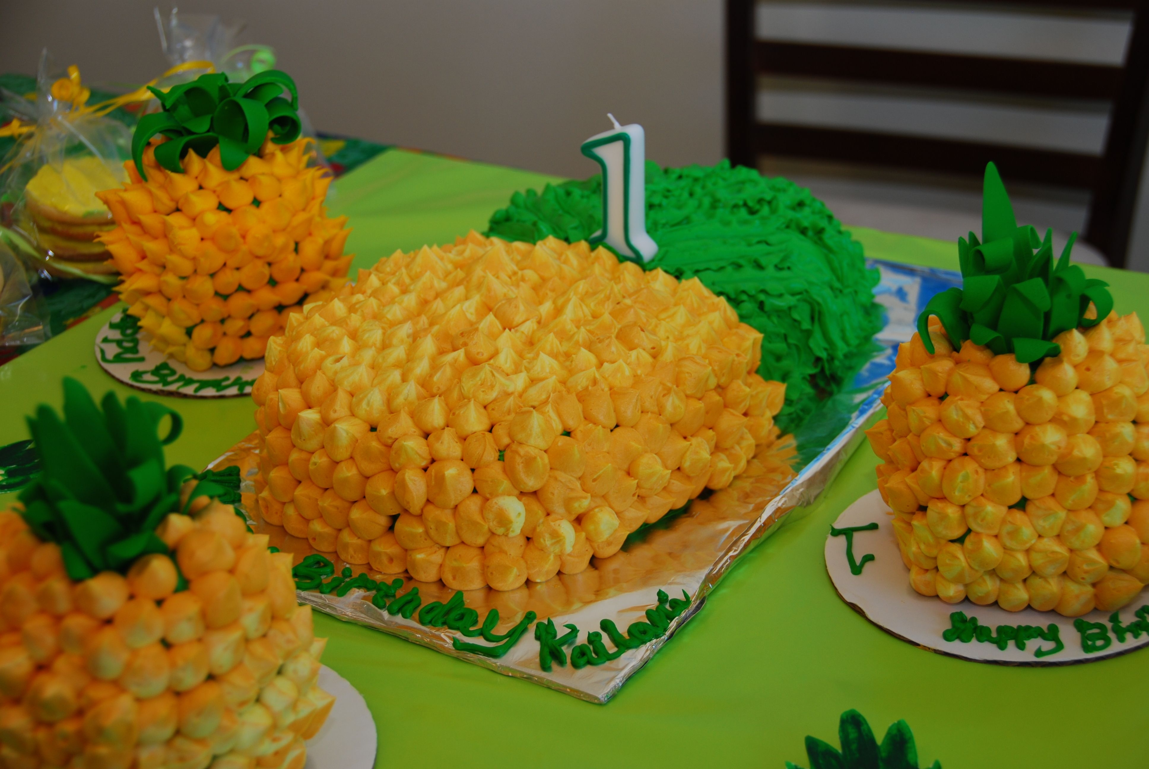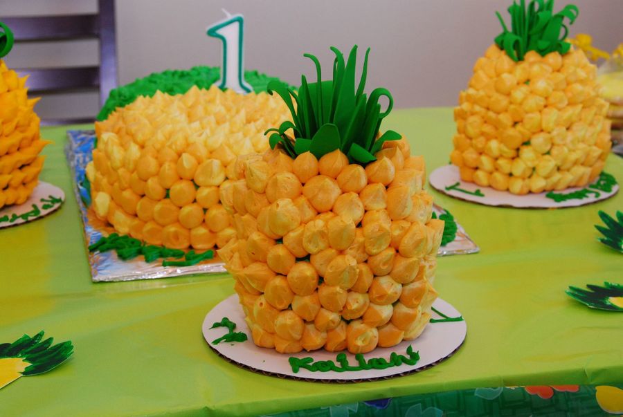 I made this mini pineapple cake for my daughter's first birthday. There were several minis made and one big one. She LOVED it. I got the idea from other cakes on this site. The cake is frosted all in italiam menringue buttercream and the yellow was piped on with just a coupler, the leaves are gum paste