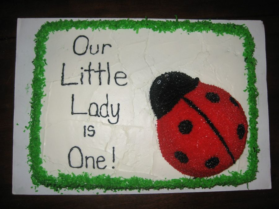 This is my little girl's 1st birthday cake. It has a matching smash cake. I used a Wilton 11x15 sheet pan, half of the sports ball pan(ladybug) and a cupcake cut for the head. I also used dyed coconut for the grass. Goggly eyes and pipe cleaners were removed before serving. Saying on the cake reads, "Our Little Lady is One!".
