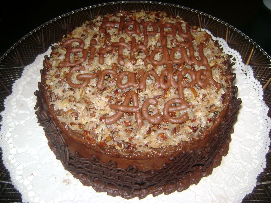 My first German Chocolate cake... all from scratch... LOTTA work just to get this puppy prepped to go in the oven! Chocolate squiggle designs on the side.