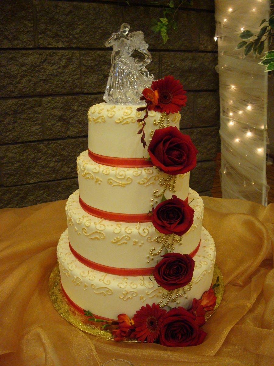 This design was painted in gold lustre dust with gold candies and red ribbon, it was for a part "chinese" wedding which was why we did gold and red.