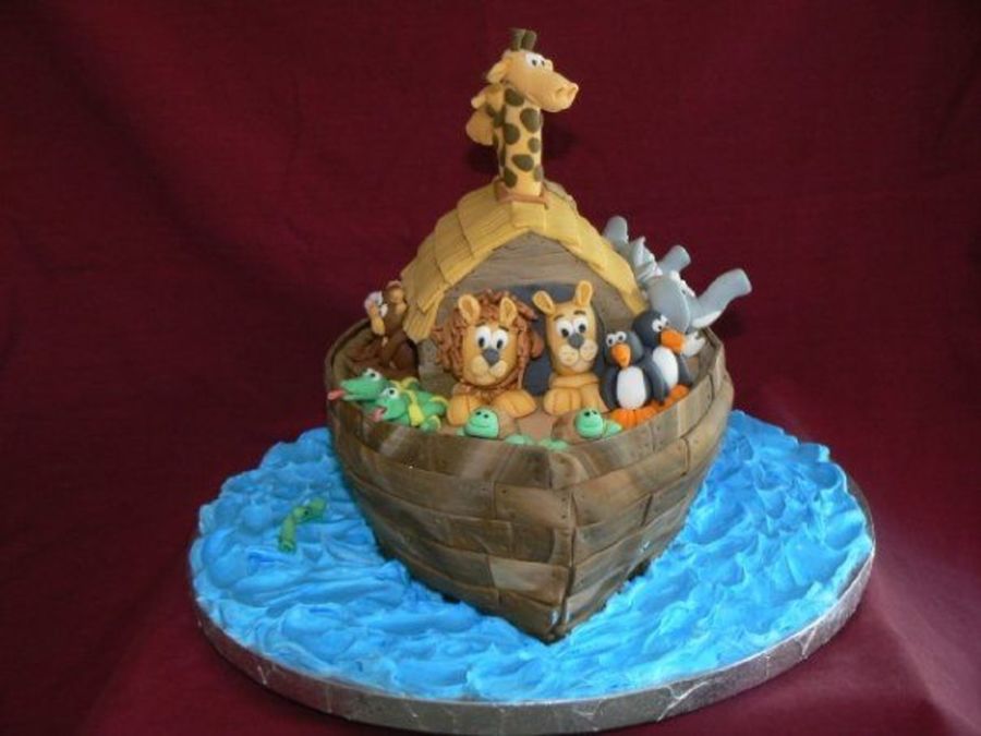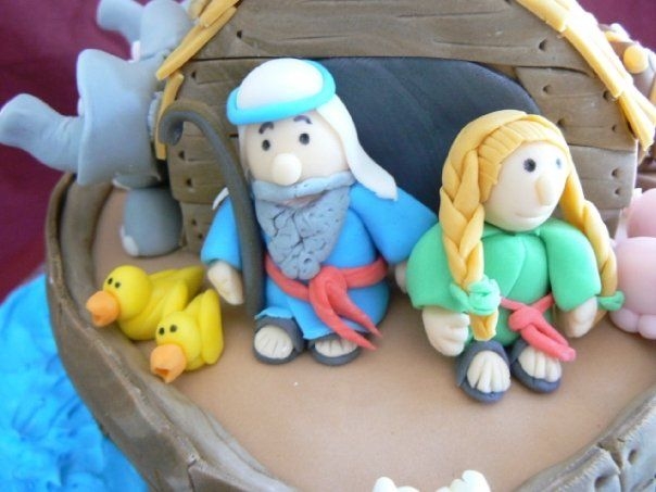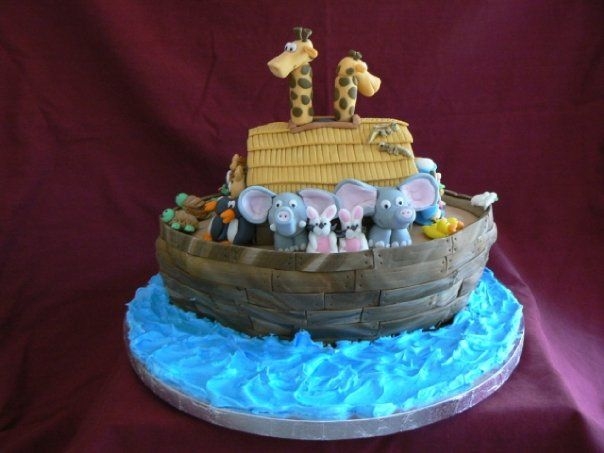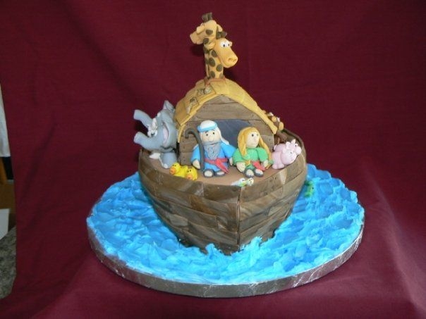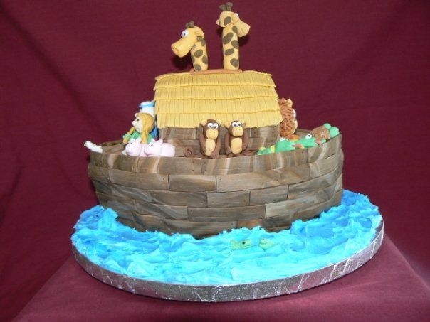 This cake was for a dessert auction at my church. Chocolate cake with buttercream icing, covered in fondant. Animals and people made with fondant. Water is royal icing. To make the wood, I made four different colours (brown, light brown, cream and black) into ropes, twisted them together, kneaded into a ball and rolled out, then cut into strips and then into individual boards. I covered the cake with a thin layer of fondant so the boards would have something to stick to.