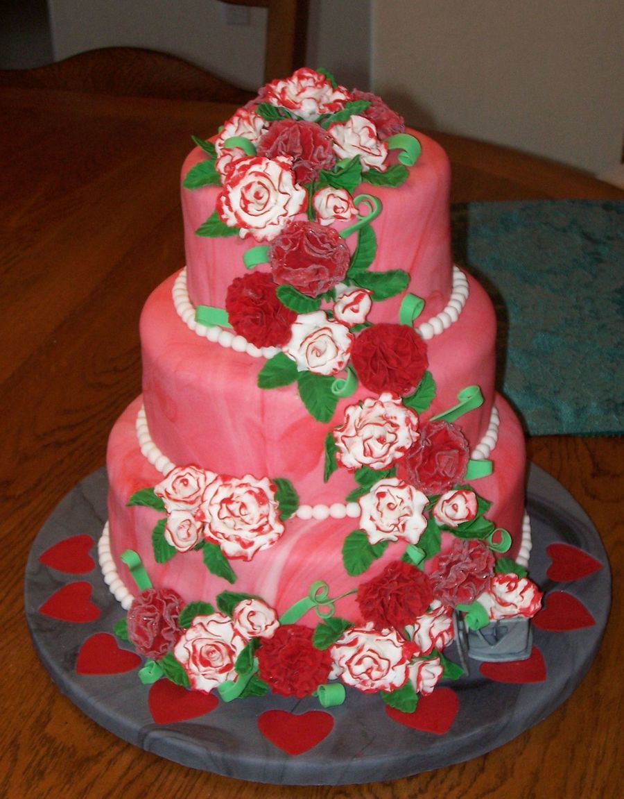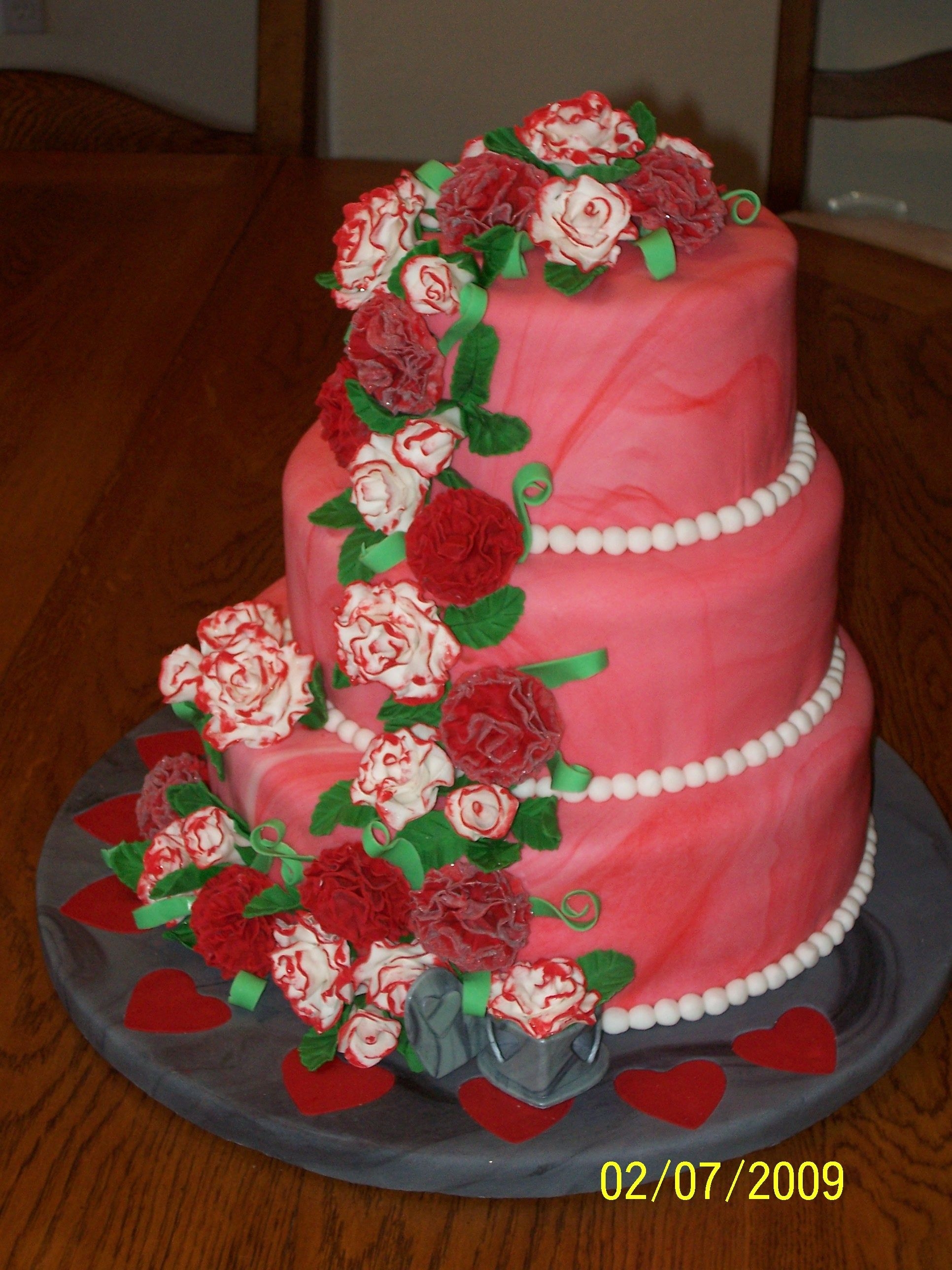 This cake was created for the 2009 Cake and Sugar Art show of Arizona. All the roses, carnation and leaves are made out of gum paste, as well as the box to the right of the cake and all the beads in the boarder are hand rolled. I did not place in the cake show, but I did very well for my first time. I am very proud of this cake!!