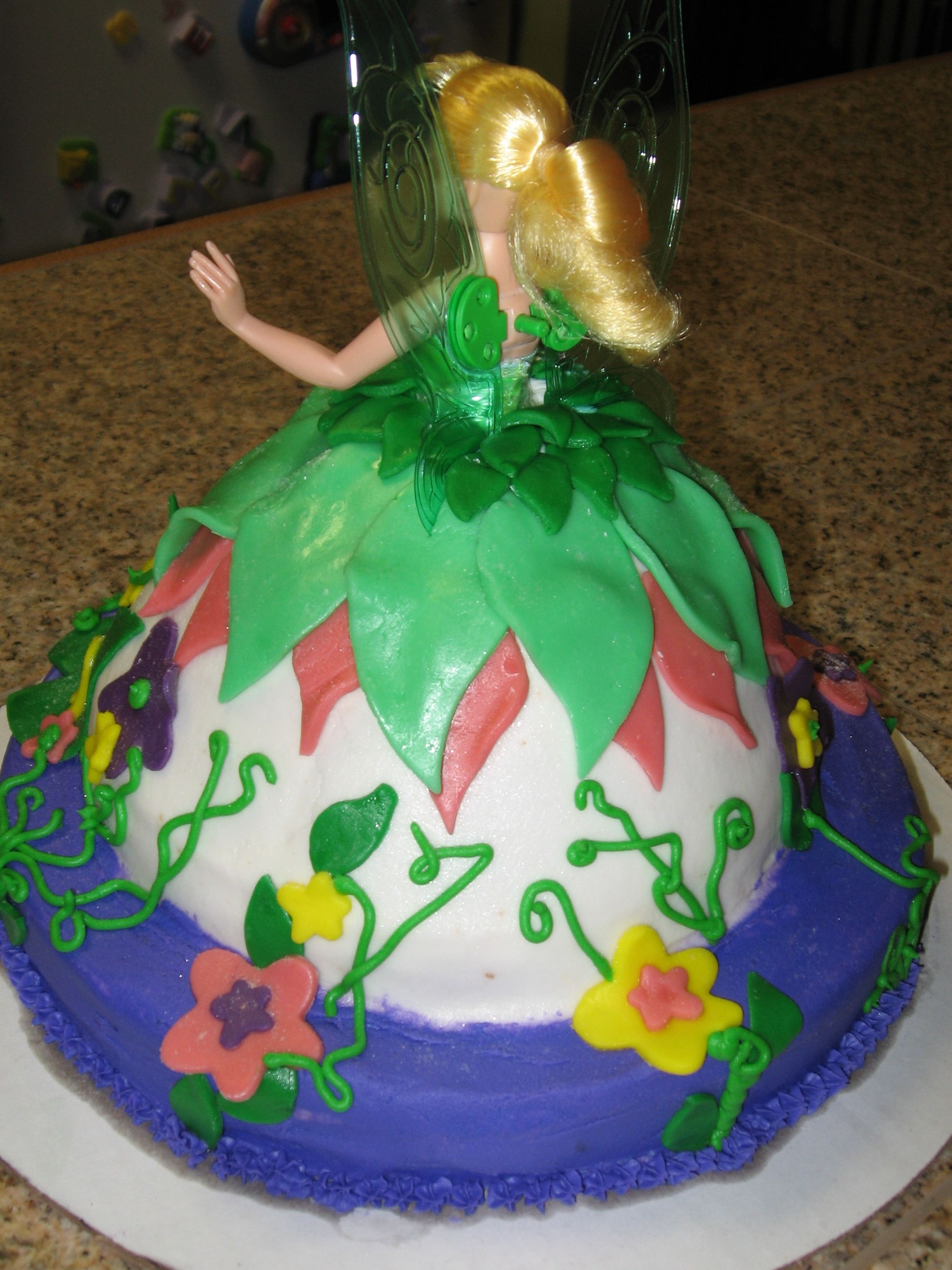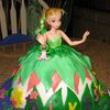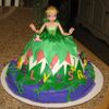 Used the Wilton Doll Cake Pan as directed. Placed Tinkerbell with plastic wrap up to her waist into the cake. Decorated with buttercream frosting, fondant petals for her skirt and flowers. Embellished with colored buttercream frosting.