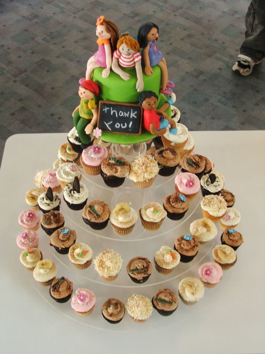 Styrofoam topper. All figres made using gumpaste. Assortment of cupcakes in a variety of flavours