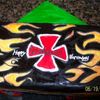 This was done for a friends son. . It was his 8th birthday and wanted a skate board cake. Cake is covered in fondant and all design is hand painted and outlined in BC. wheels are RKT covered in fondant. Cake is double chocolate chip with strawberry filling.