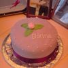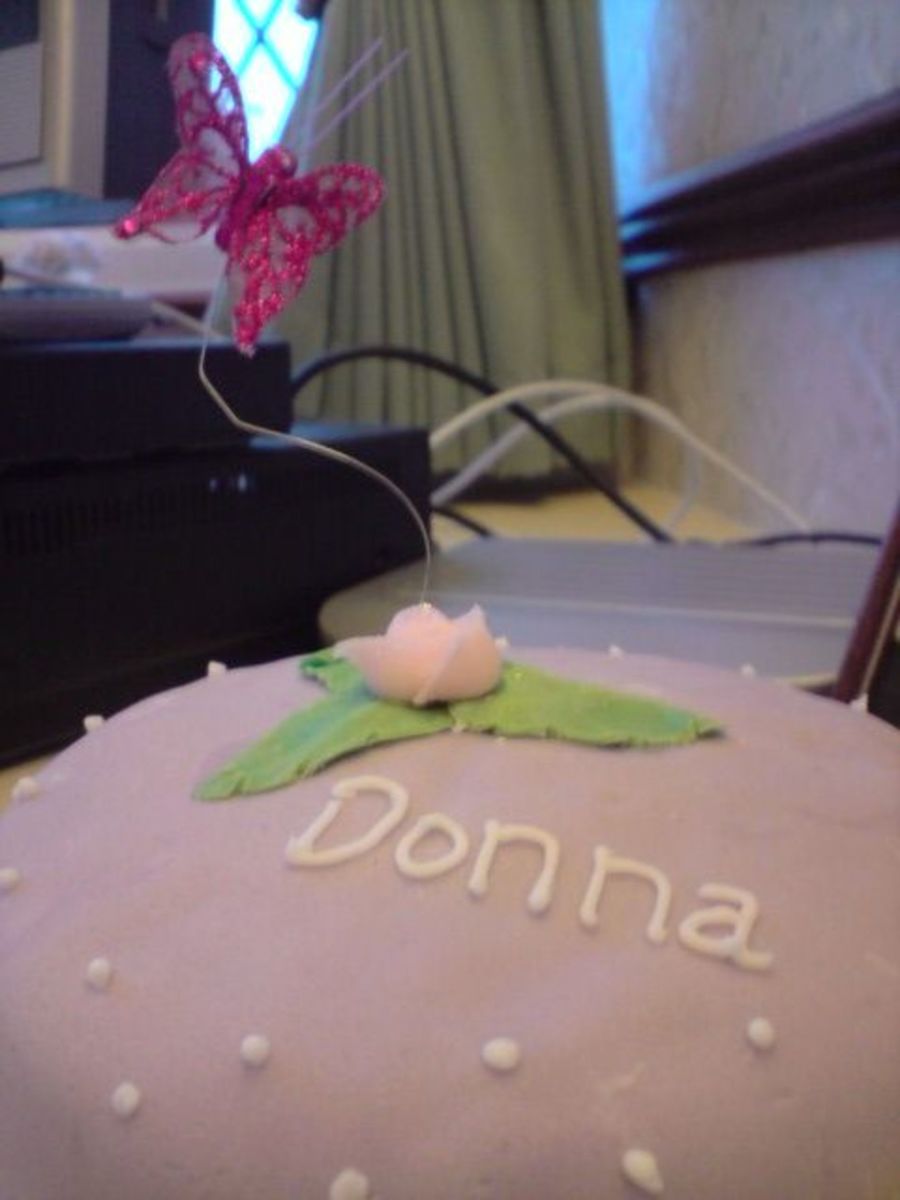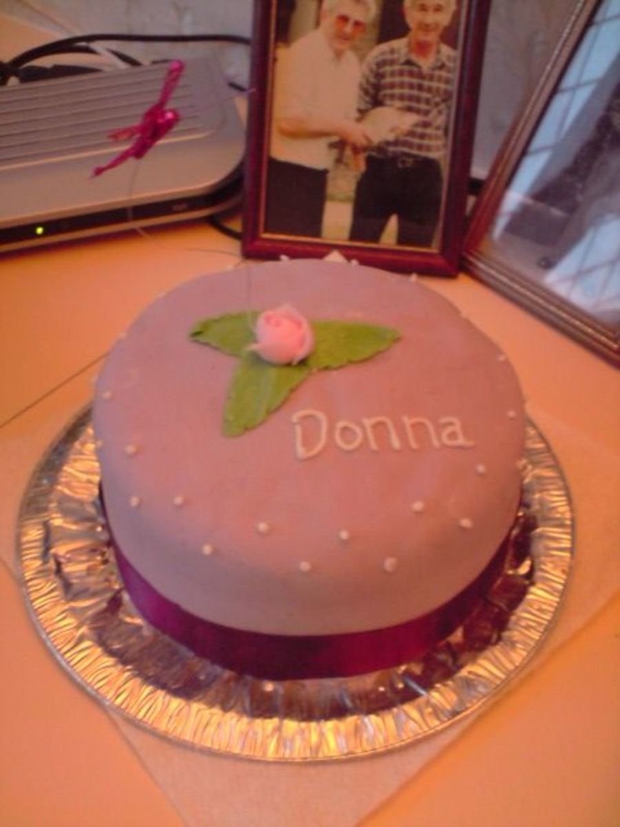 A mum who loves purple. Sponge with "grape vine" coloured fondant with piped royal icing rose with fondant icing leaves. Sprinkled with glitter, piped and finally trimmed with deep purple silk ribbon :D