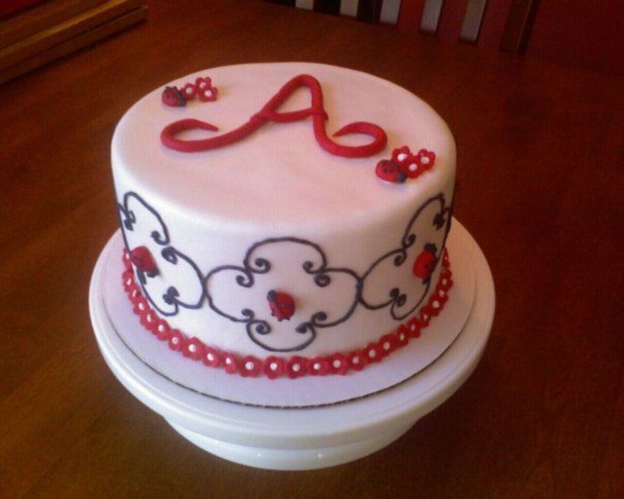 Chocolate WASC iced and filled with chocolate ganache, covered in fondant. Fondant letter A, ladybugs, and forget-me-nots, with RI piping. Luster dusted the main part of the cake, but I guess I need a lot more. As I got ready to do the black scrolls on the white cake, the insanity of that decision (considering my WAY novice skill level) struck me - but I did the best I could.