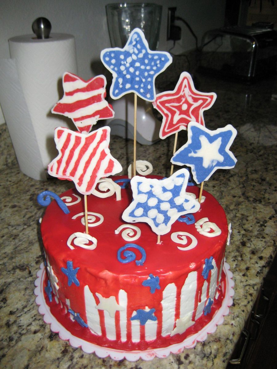 frosted in BC, red pored chocolate ganache , stars are made of candy melts