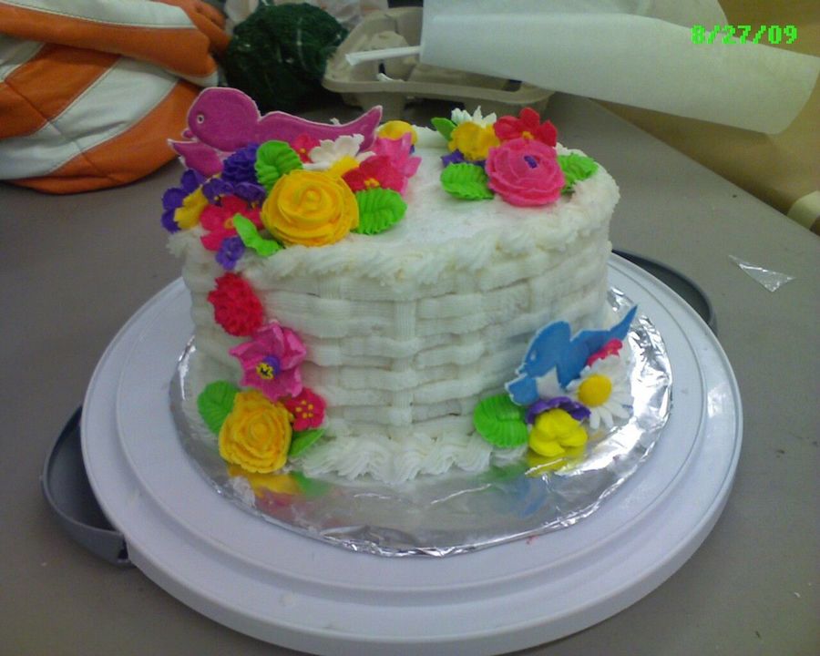 this is my course 2 final cake. basketweave and all the flowers we made. i could have done better.