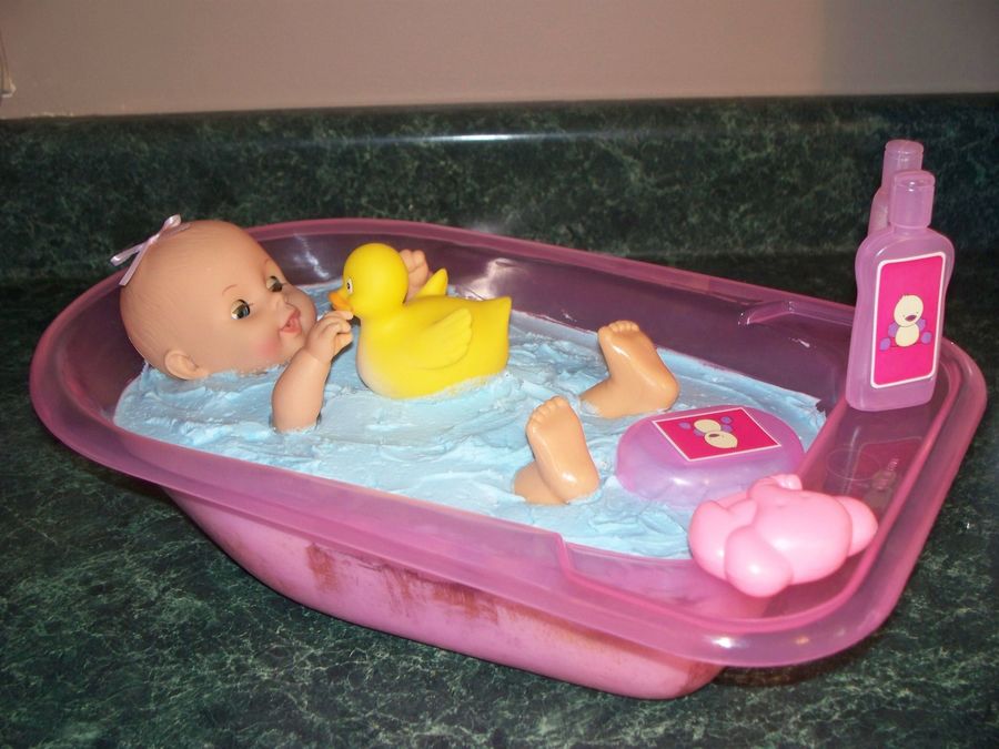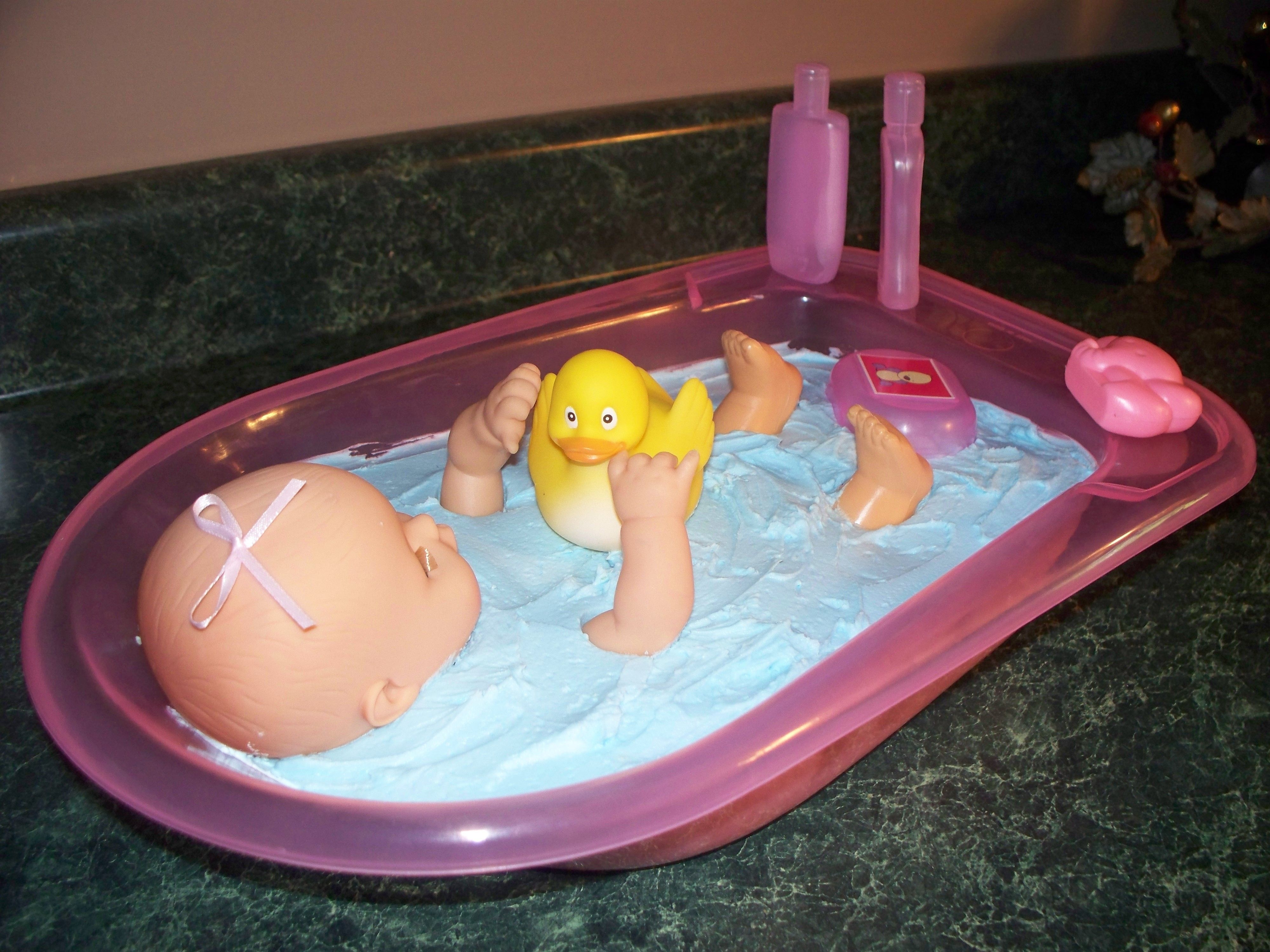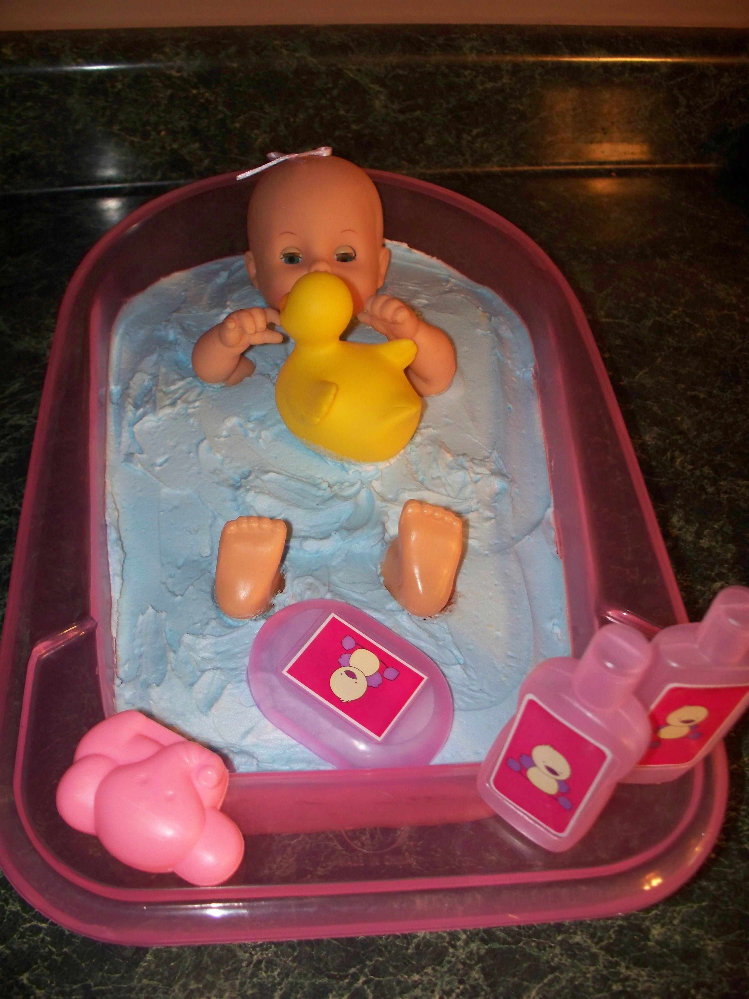 Baby tub and doll came from Walmart. I baked a yellow cake and cut in pieces to fit in the tub. Used blue homemade buttercream icing to look like water. Cut the baby arms and legs to fit, popped the head off, and put it all in the icing. Placed the accessories and that was it. I got the idea when i was browsing the toy isle in Walmart. I saw the tub and thought it would make a cute cake.