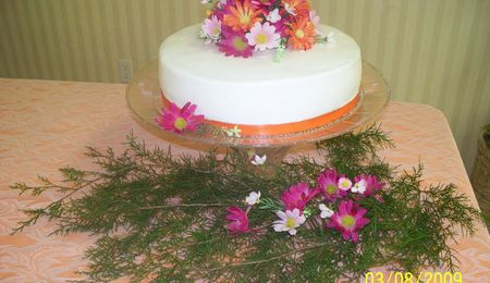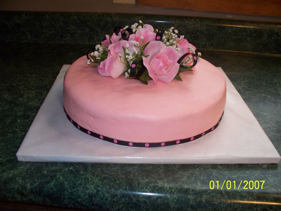 i made this for my mary kay debut. it is a white cake with buttercream icing. inside is filled with strawberries and strawberry gel. artifical bow and flowers for topper and ribbon for trim. it was really yummy!