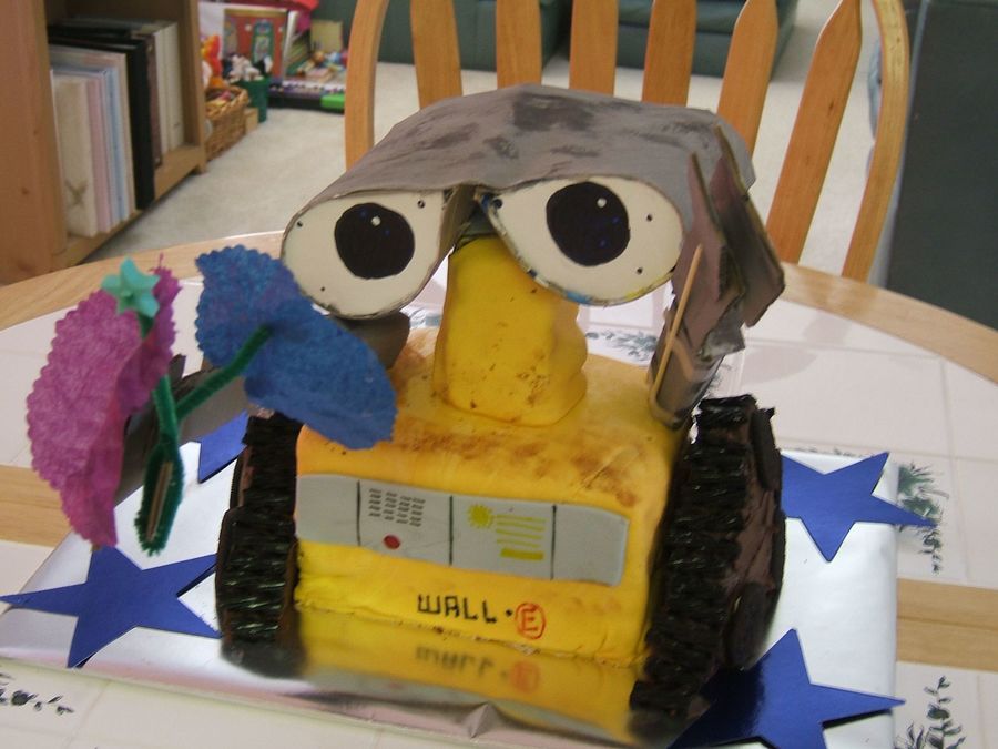 Wall-E, our favorite Disney movie. Neck and body are iced cakes covered in fondant. Wheels are a square cake, cut into triangles, frosted with chocolate icing, with black Twizzlers for the wheel ruts. Arms holding flowers and eyes are made of cardboard.