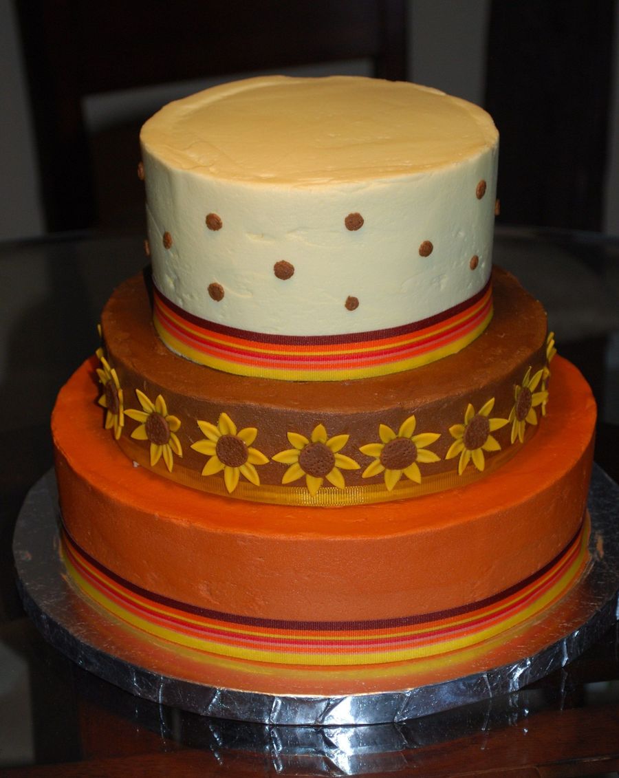 all buttercream with ribbon trim. The sunflowers are fondant. There will be a flower arrangment that my friend is going to put on the cake once it gets to the shower. That would be why the top is empty.
