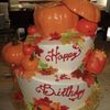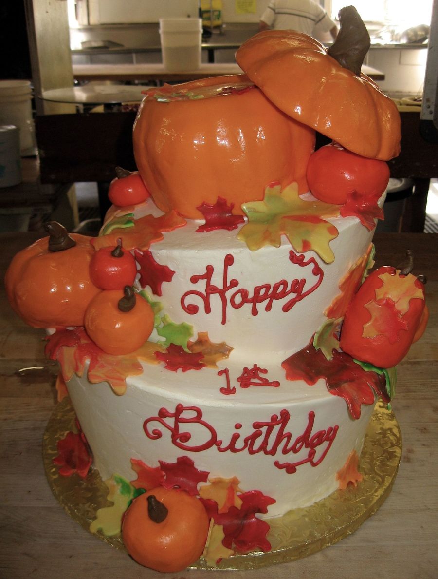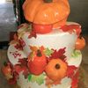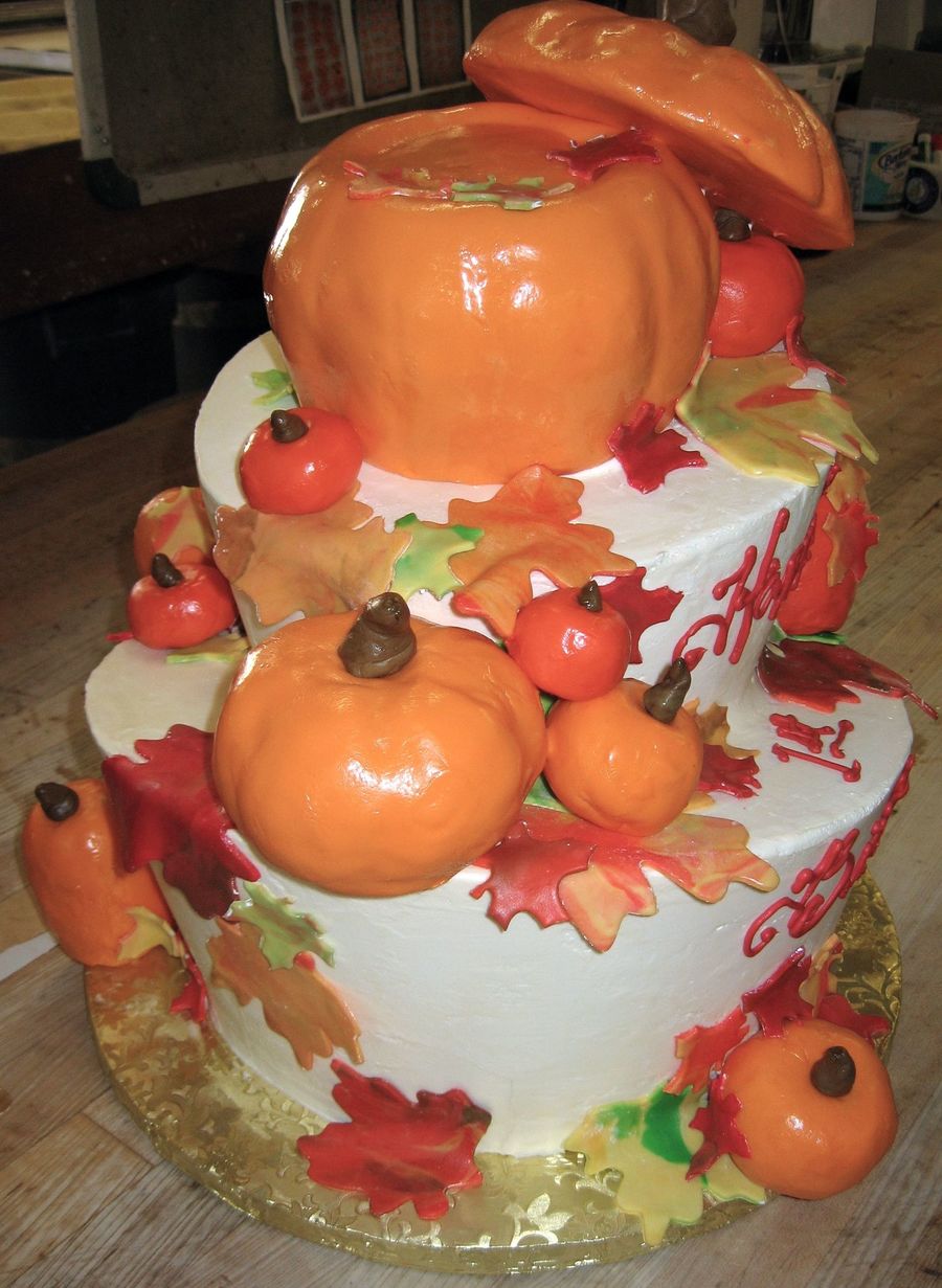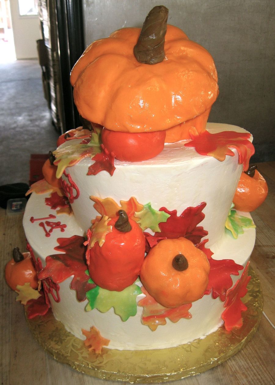 Mad Hatter style cake. Top tier pumpkin is carved cake. The top pumpkin "lid" and all other pumpkins are hand molded rice crispy treats, covered with MMF. Bottom two tiers are frosted with SMBC. Leaves are MMF. Fall '08
